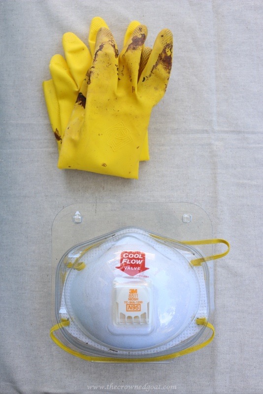 It’s also really important to have protective eye wear (currently on my head), gloves, mask/respirator and an apron to protect your body/clothing (currently wearing). I know a lot of you guys rescue pieces from old barns, estate sales and the curb too. You can’t be too careful when it comes to protecting yourself while your DIYing.