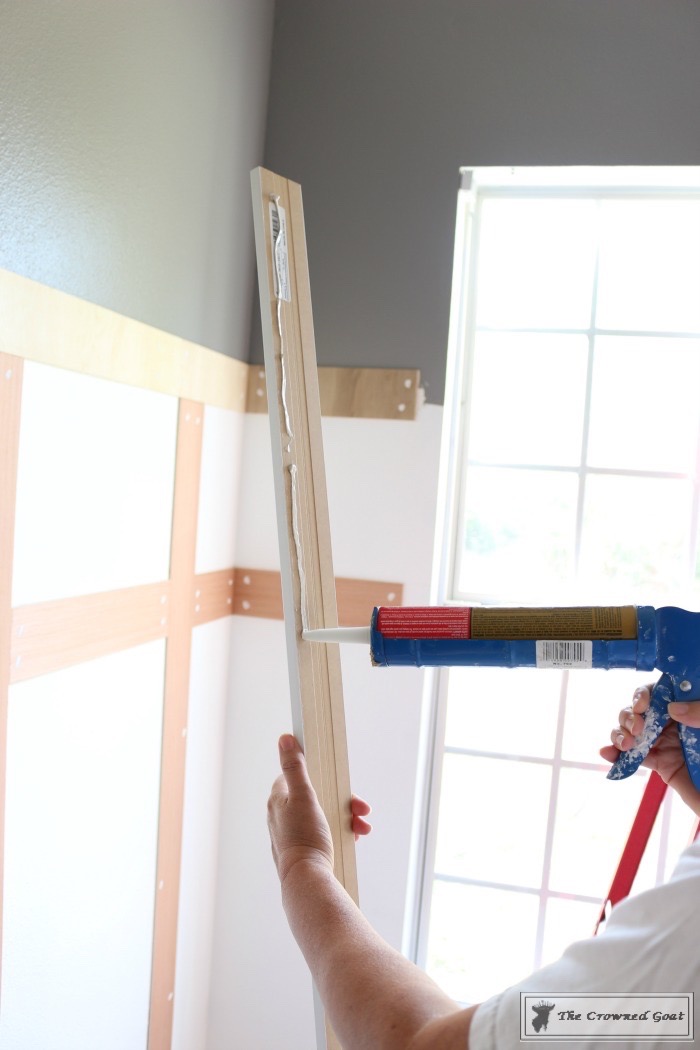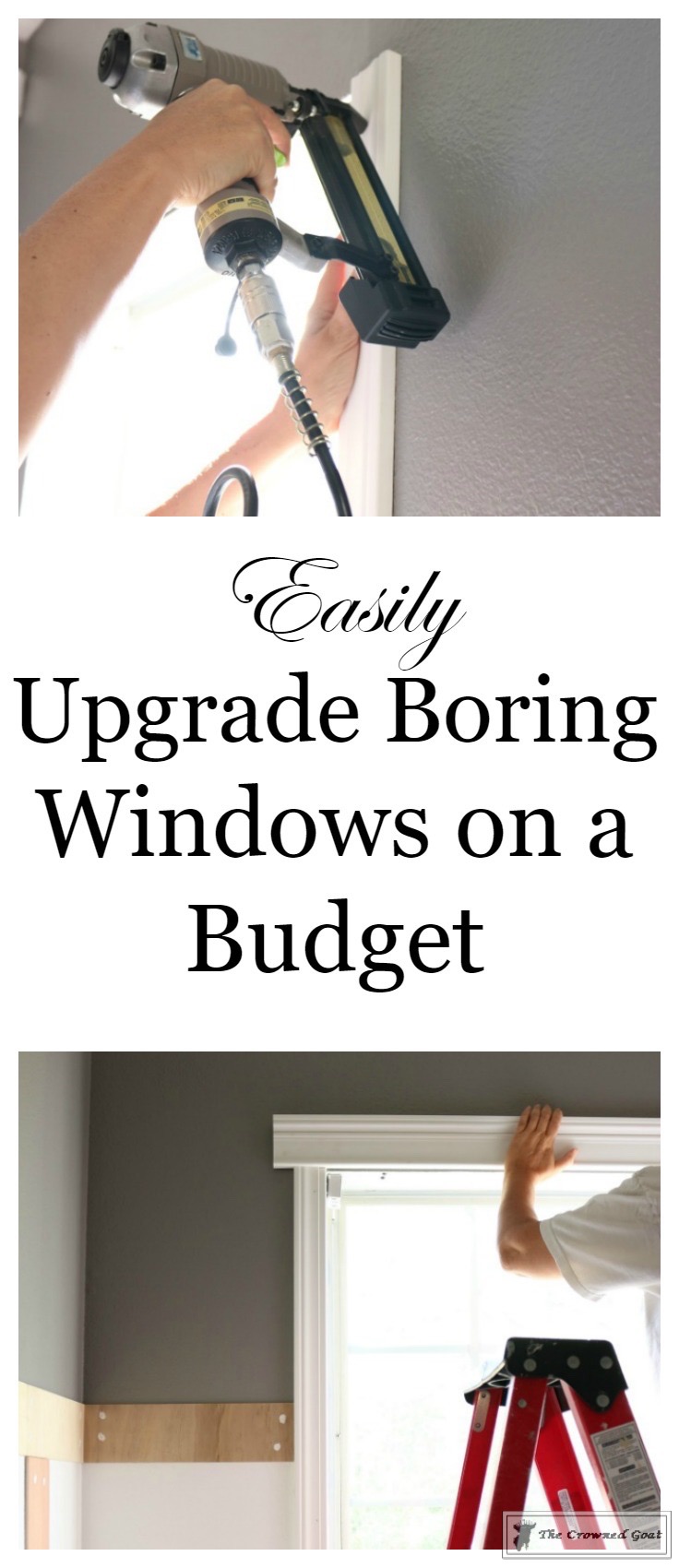 given the board and batten, we decided there should be something a bit chunkier on top. This piece was a little under $20 and we found it at our local home improvement store as well. We used the same process to attach the top as we did to the attach the trim to the sides. This one piece wound up being enough for both of the windows keeping this project very affordable. You can leave about an inch overhang