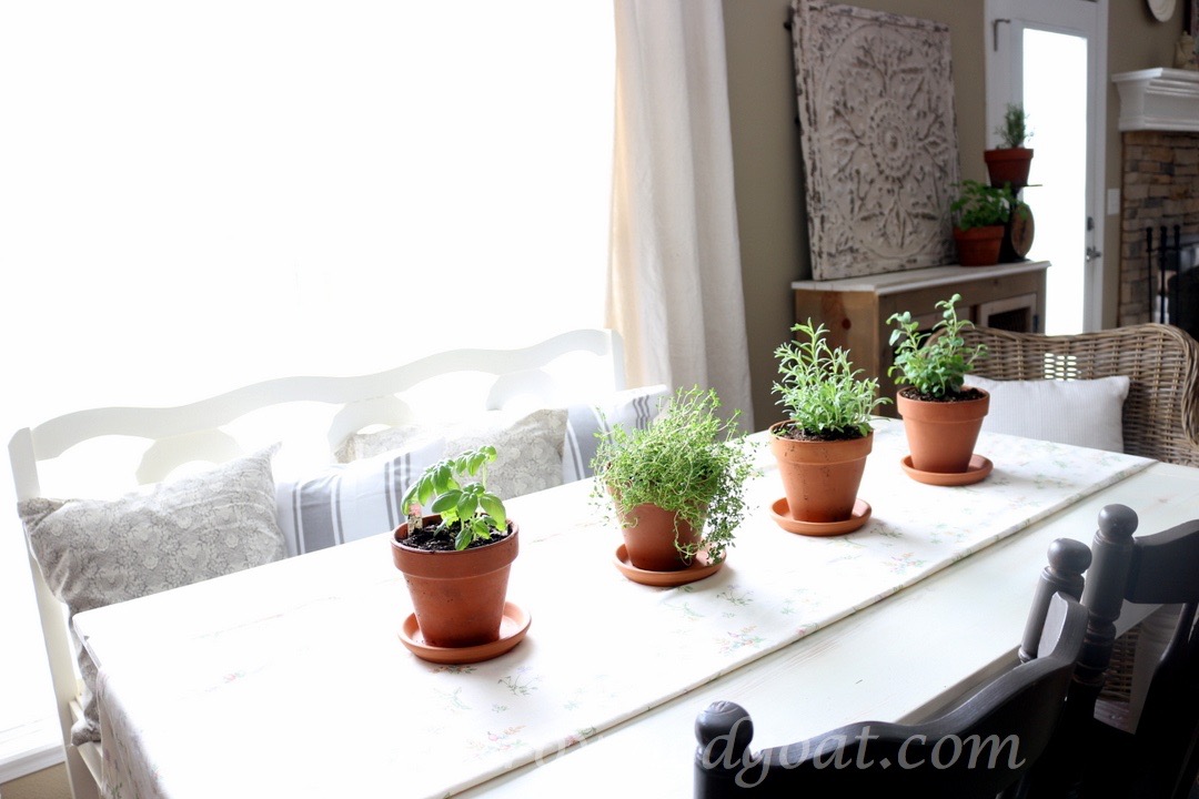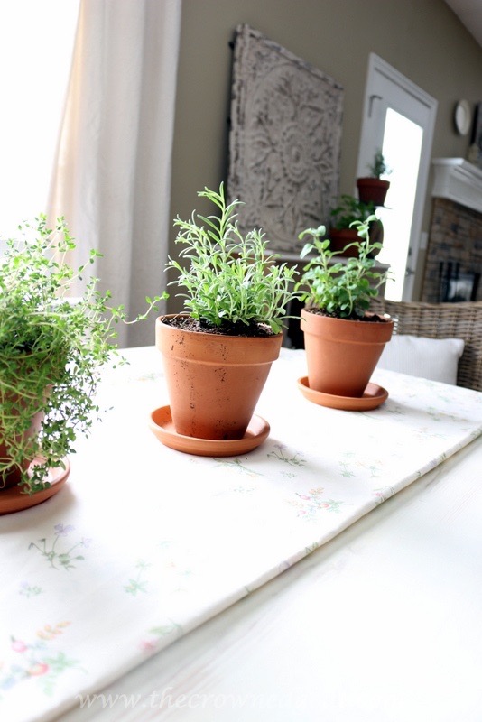 Let the Sunshine In – herbs need at least 4-6 hours of light per day to stay healthy. If you don’t have a lot of light in your kitchen, try placing the plants in a south or west-facing windowsill. Keep in mind as the temperatures rise so does the heat coming off the windowsill. If you’re in a hot, humid or dry climate your herbs will probably not appreciate staying in the window sill in the summer months so make sure you place them a few feet back during this time. Also, you’ll want to provide a way to protect the surfaces you put your herb garden on like a saucer under each plant.