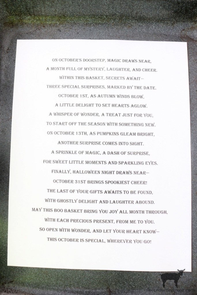 Given the Boo Basket poem holds clues for the other gifts and surprises we’re planning throughout the month, I folded those aged pages and sealed them with wax.