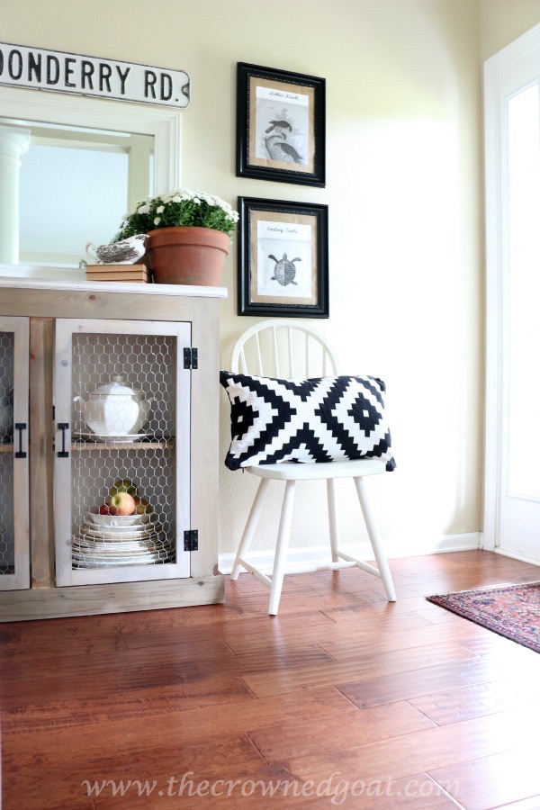 The entry was really easy to put together, thanks to pillows from IKEA and a little nod to my Native American grandmother. I heart brown and white transfereware too.