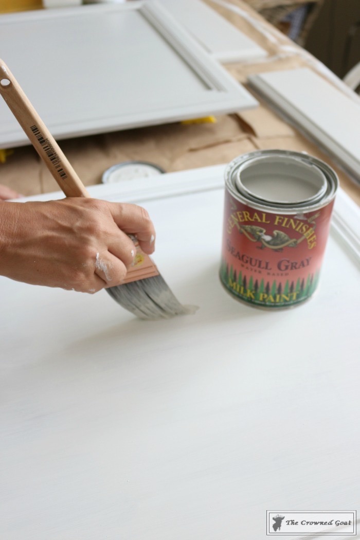 Use a completely different brush (a foam brush is recommended) to apply the first coat of General Finishes Milk Paint in Seagull Gray evenly with the grain. If you’ve never used this brand of milk paint before, the paint is very easy to apply. It’s ready to go right out of the can so no extra mixing (other than stirring well before use) is necessary. The consistency of the paint is really smooth and creamy.