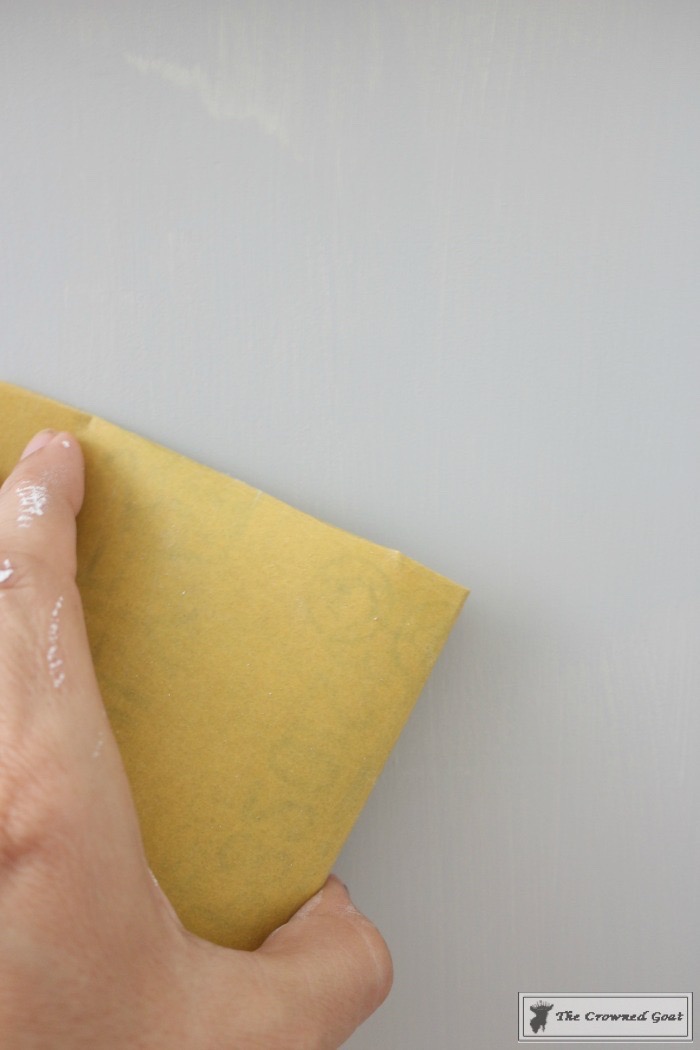 After the first coat of milk paint has reached the proper drying time (as per General Finishes recommendation), lightly sand using 320-grit sandpaper, again remove any excess sanding dust with compressed air and wipe clean.