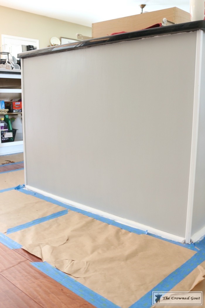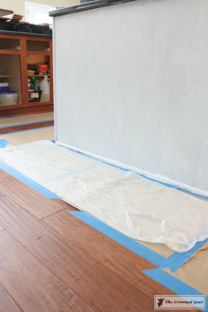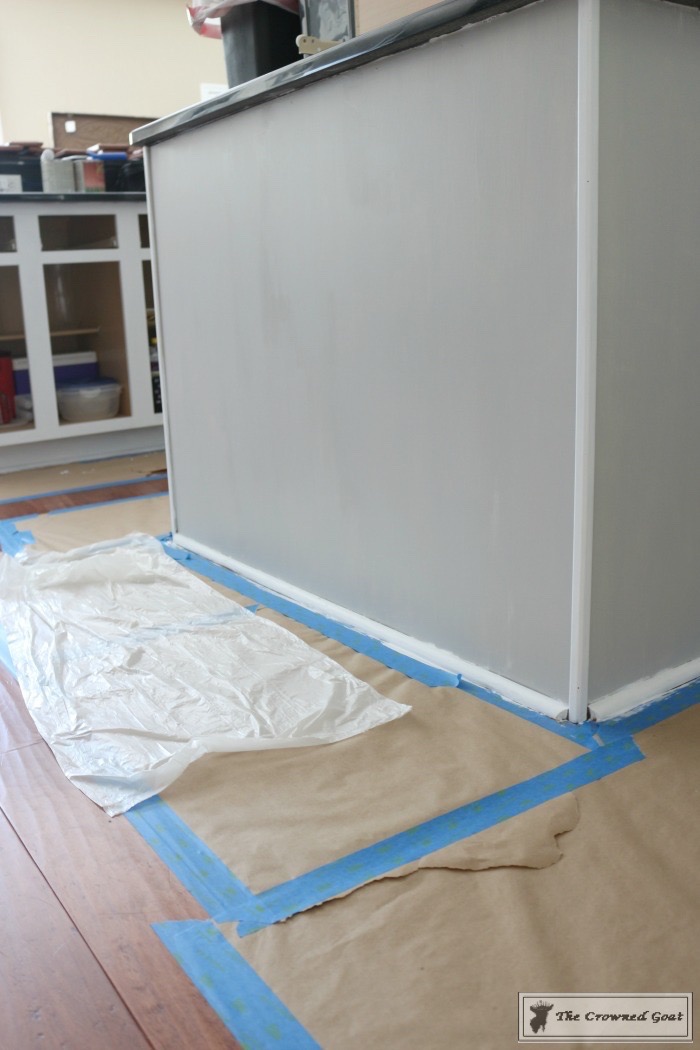 Outline areas you don’t want paint on (i.e. between the quarter round or moldings and the floor, inside the cabinet floor/walls/ceilings and underneath the island and the countertop) with painters tape.