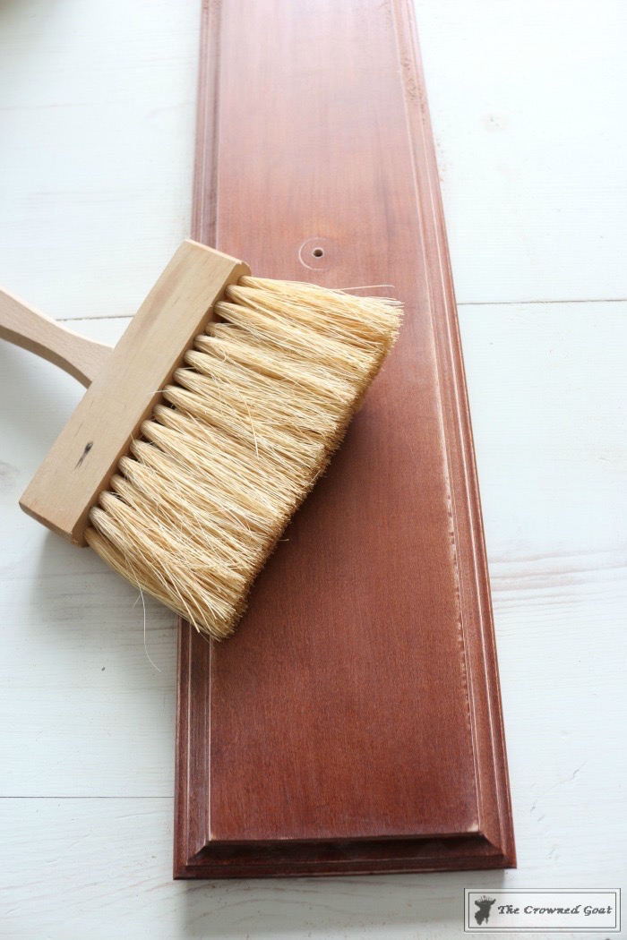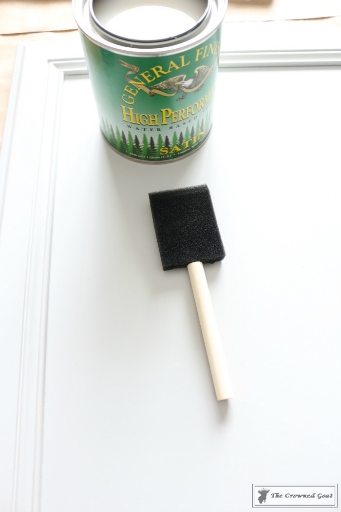 Use a completely different brush (a foam brush is recommended) to apply the first coat of General Finishes Water Based High Performance Topcoat evenly with the grain. If you guys have never used this top coat before, it’s SO awesome! It looks kind of milky white in the can but it dries clear and quickly.
