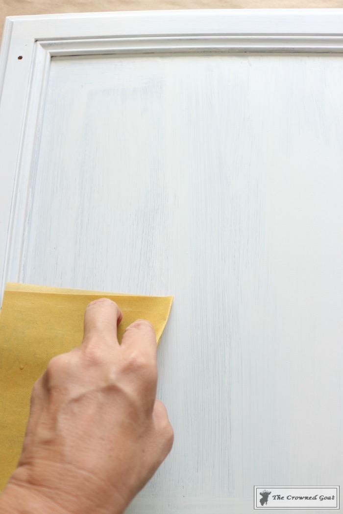 Sand drawer fronts, cabinet doors and wood base of the island with 220 grit sandpaper.