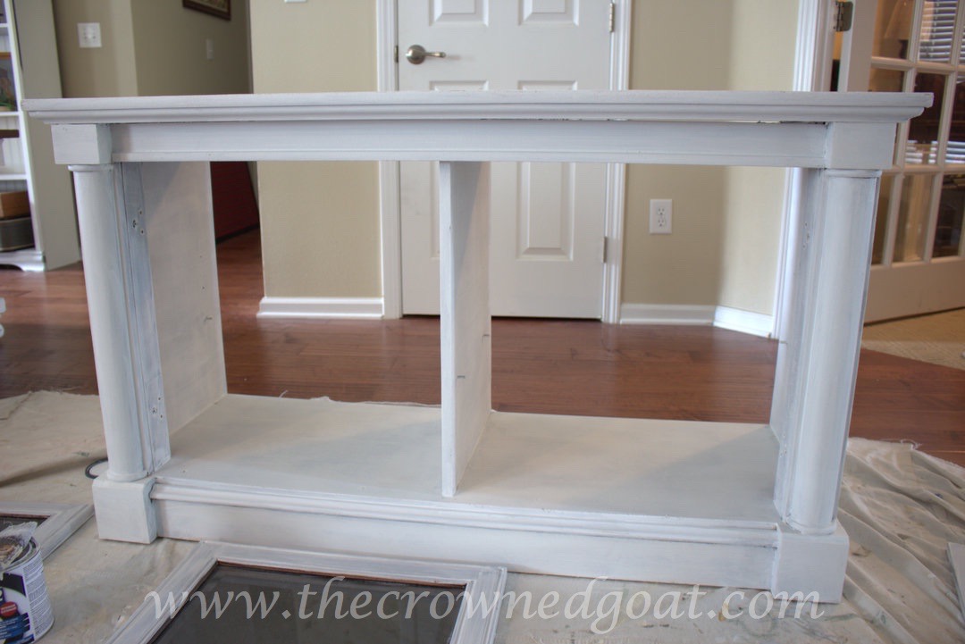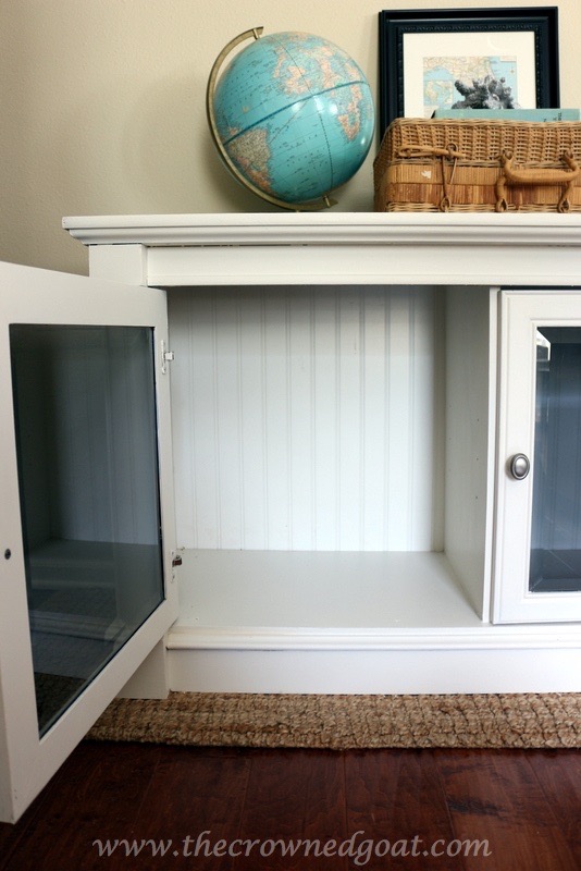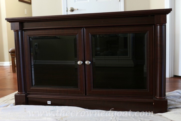 We carefully removed the back and the doors of the media cabinet to make it easier to paint. Since laminate furniture is made from a particleboard base there is a chance the particleboard will easily chip so use caution and care when completing this step.