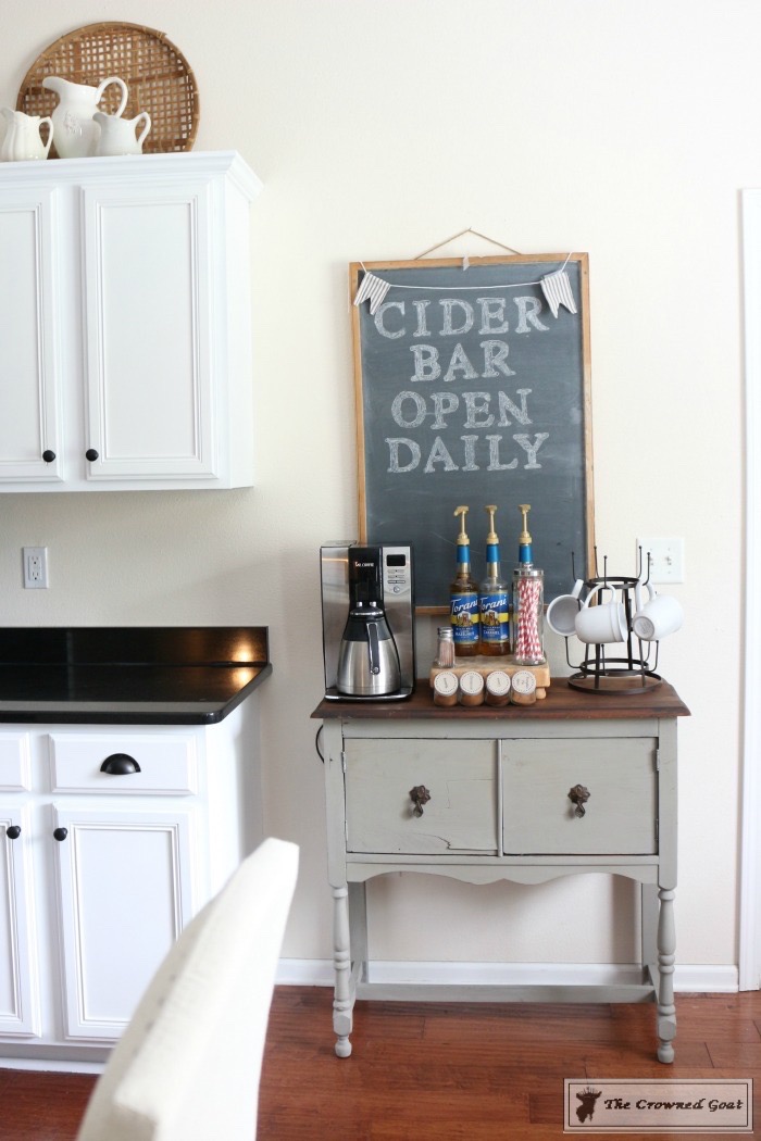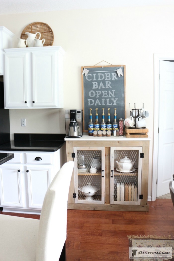 I concentrated on the indoor coffee station first. This farmhouse style weathered cabinet is one of my favorites but it was just too big for the space….