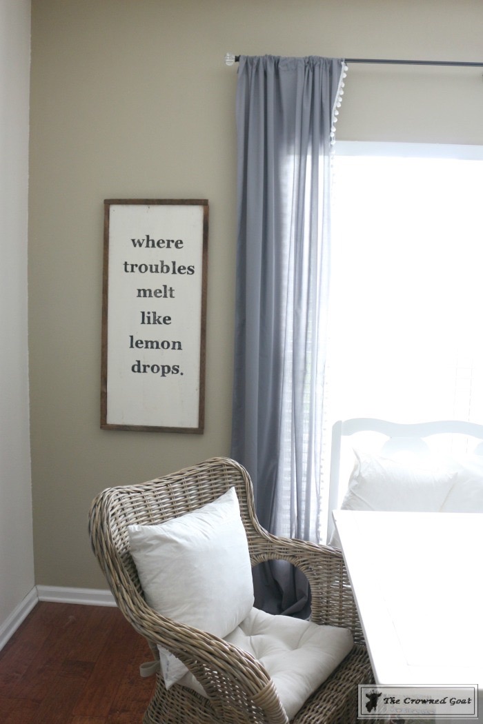 This window has an awesome view of the patio and a good portion of our property so we wanted to make sure it was framed properly. I tried to use the no sew pom pom curtains but they fell really flat.