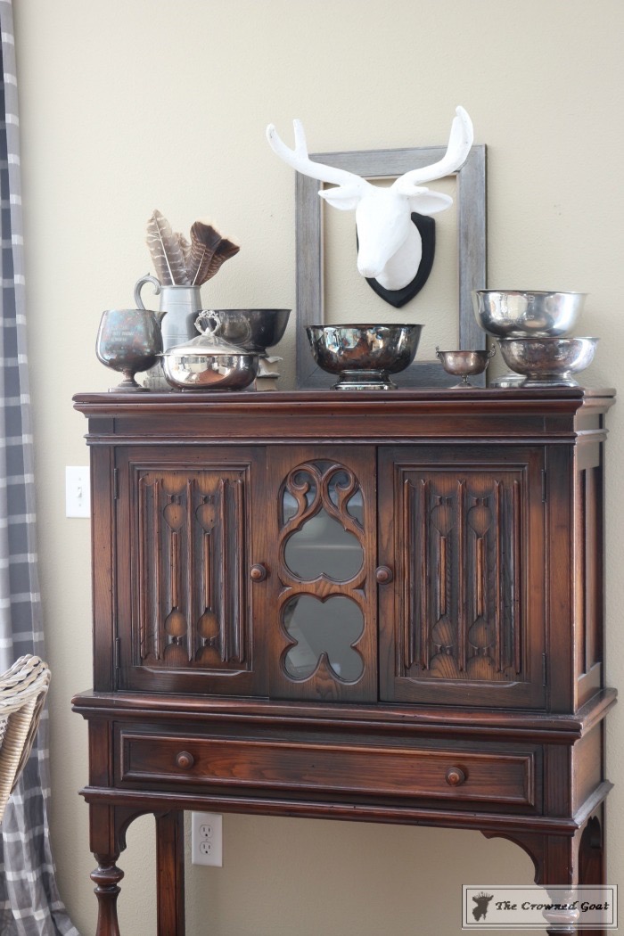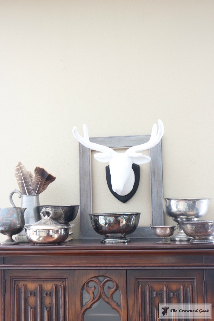 I topped the antique cabinet with my growing collection of tarnished trophies and added the paper mache deer that used to hang over the indoor coffee bar to complete the look.