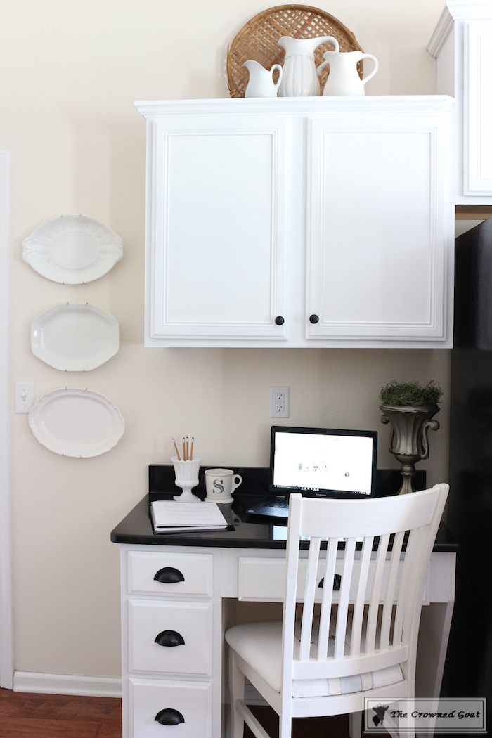 The cabinets are beautiful. Great job !!! I suggest a picture over the outlet above the desk – something easy to remove when