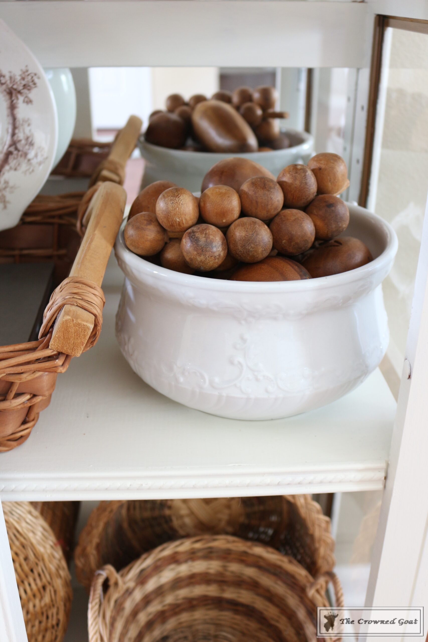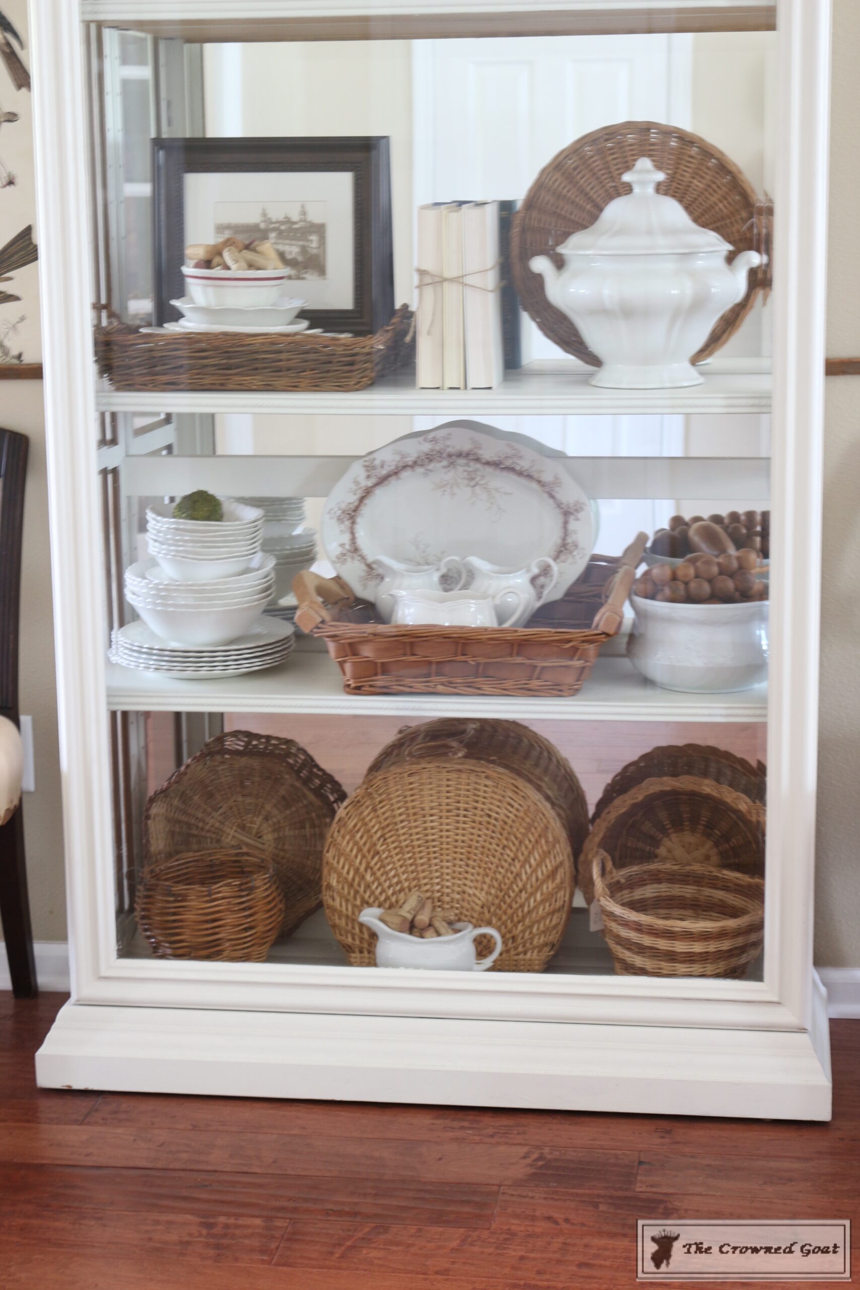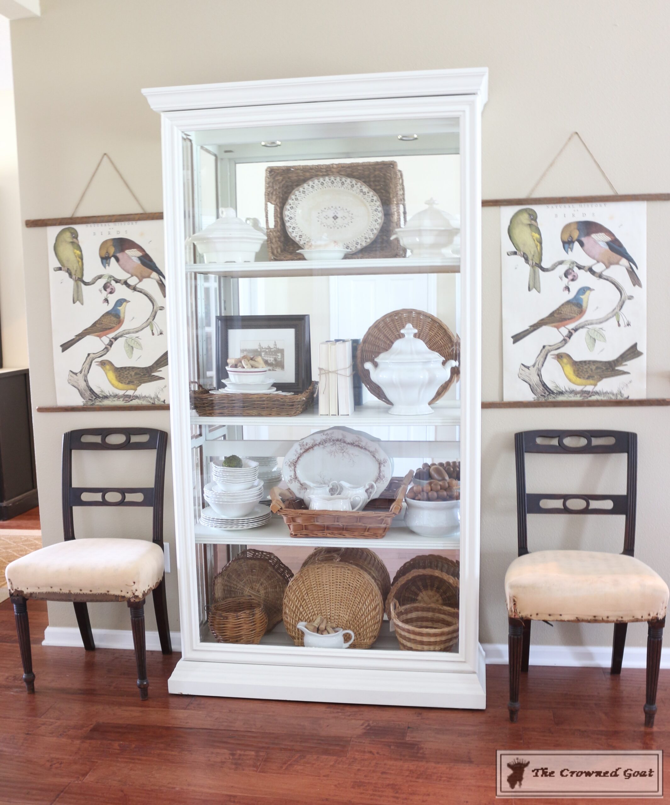Once we changed out the brown and white transferware usually housed in the display cabinet, it left an empty shell in which to be completely creative. Styling shelves for a display cabinet is really no different than styling shelves for a china cabinet or even a mantel. I use these 5 simple steps when styling and creating vignettes for shelves: