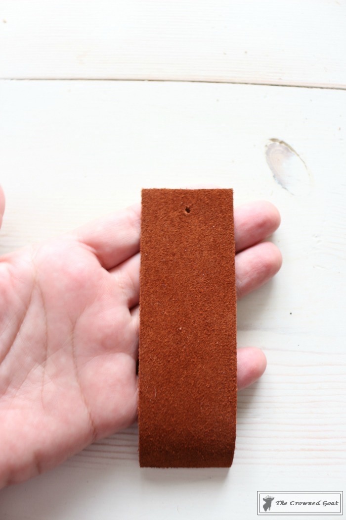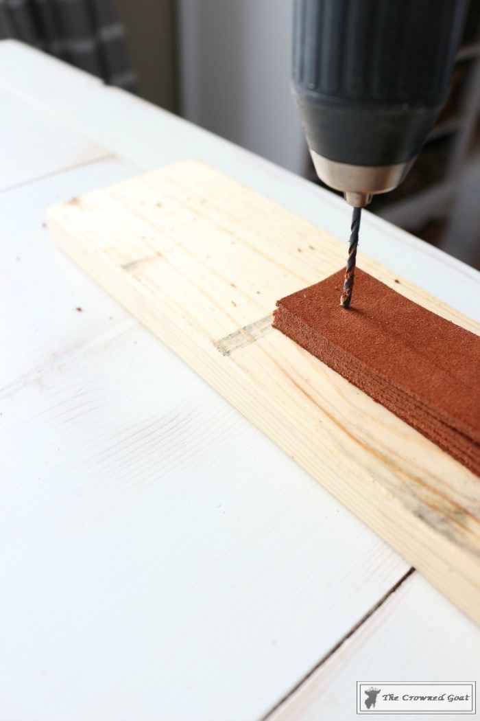 We cut the straps to straps to pull size then used a small drill bit to make two holes (one at each end of the leather.) As always, use caution, care and all necessary safety precautions when you’re using glue, power tools and all other sharp tools you’ll see in the following photos.
