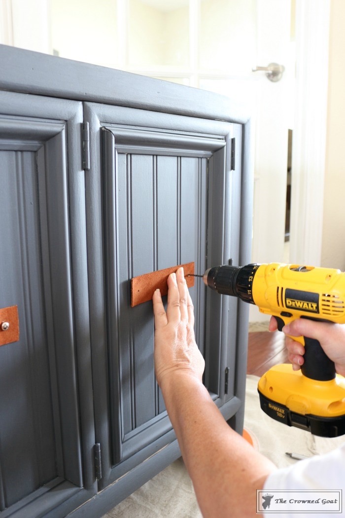 Then we used the drill and a larger drill bit to place screws into the leather strap securing it to the cabinet.