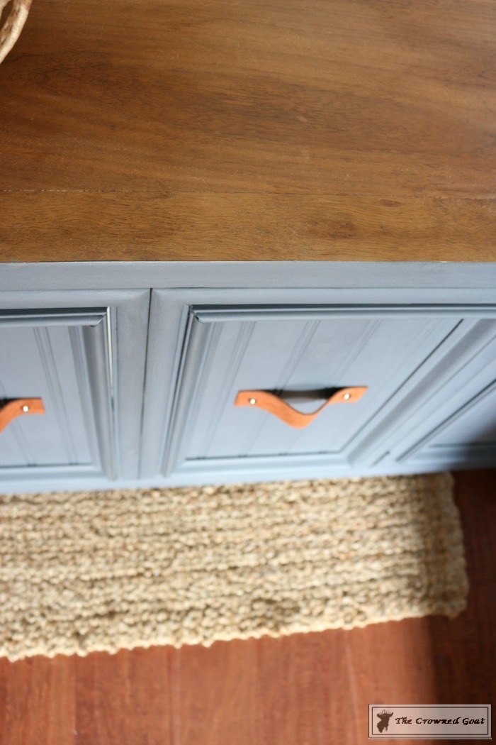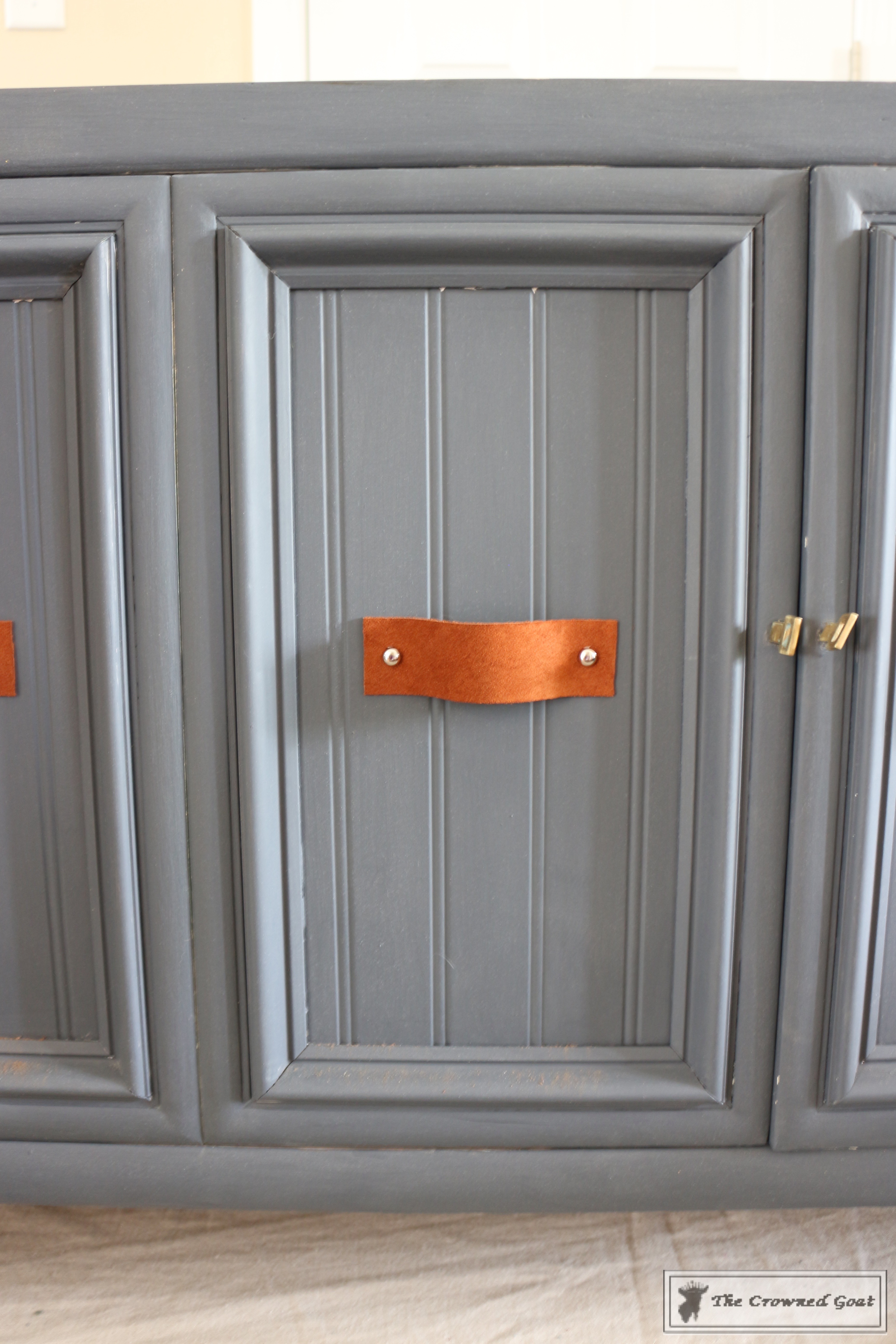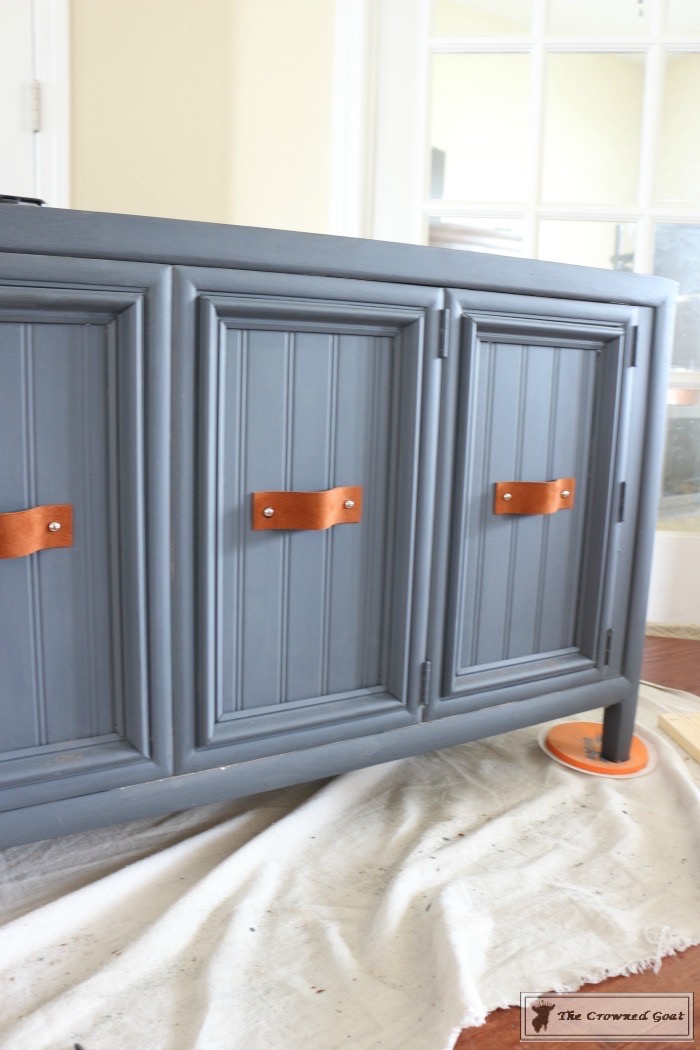 Once we had the holes drilled, we use a measuring device to make sure the leather strap was placed where we wanted it on the cabinet.
