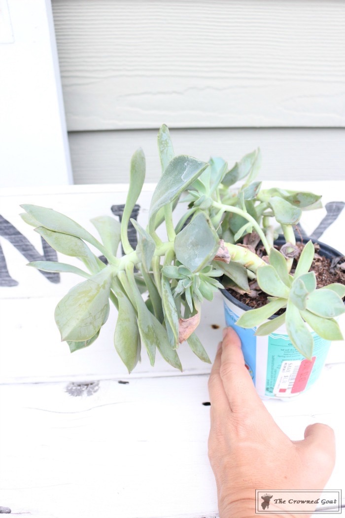 We were out on the back patio a few days ago enjoying the early morning sunshine and a cup of coffee when this old watering can caught my eye again. I immediately thought about making it into a planter for succulents and headed to town for a few supplies. Imagine my surprise when I found these pretty plants on sale at Walmart (I know!) being marked down to less than $2.50 each.