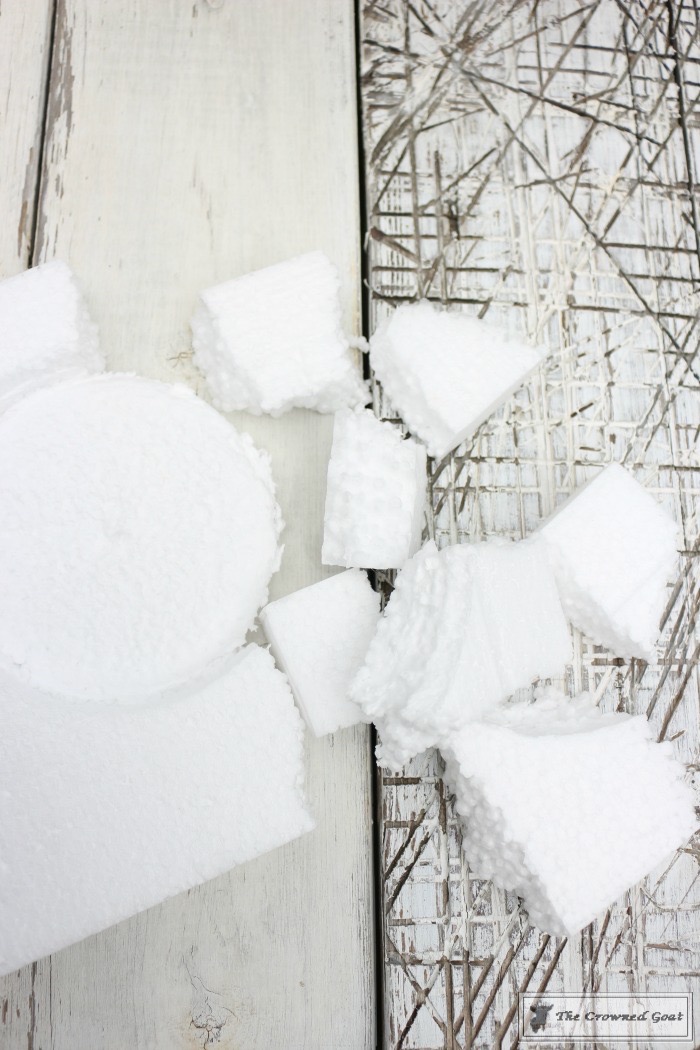 Make sure your container has some sort of holes so the water can properly drain. If you have a deep container like this one, you may want to consider using packing peanuts or styrofoam to place in the bottom of your container. I just broke apart pieces from the foam our sconces were packed in…