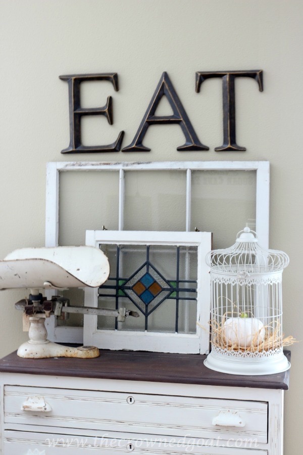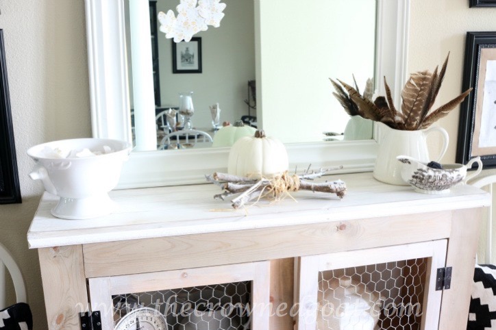 This vignette closest to the breakfast table area is one of the only vignettes I don’t change out on a regular basis. It looks clean even though it’s layered and I love the mix of salvaged items and new items. To make it look festive, I added a bit of raffia and a dollar store pumpkin I painted off-white with craft paint.