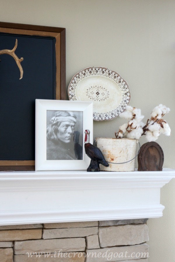 These items were all part of the Thanksgiving Inspired Mantel but they were in totally different rooms before I brought them all together. I shopped the house for the platter, turkey cologne bottle, the salvaged metal bucket, cotton and horseshoe saving shopping time and money.
