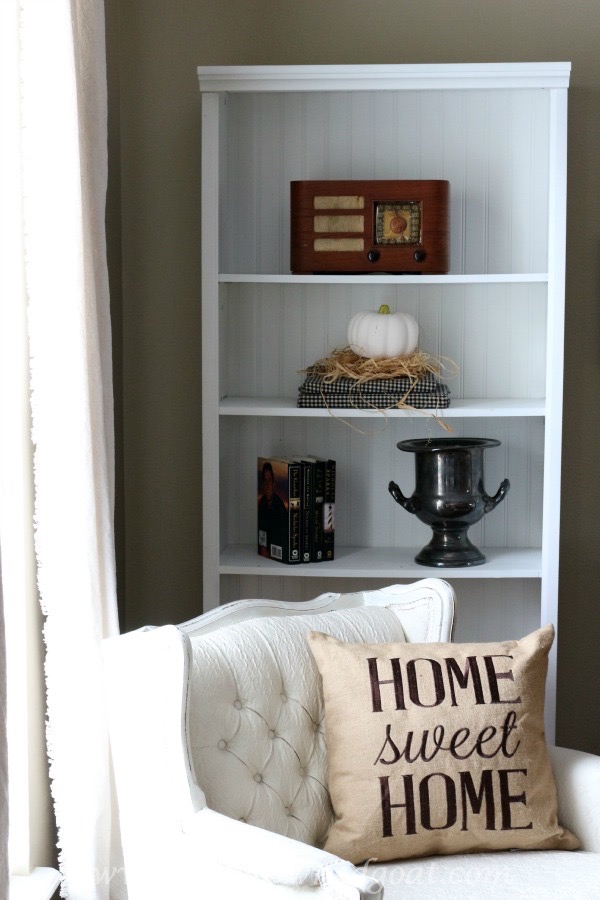 If you have bookshelves in your living room like we do, consider wrapping your books with fabric like burlap, gingham or craft paper to give them a festive look. These are wrapped with a black and brown gingham checked fabric I found last year at Walmart. They’re topped with another dollar store pumpkin.