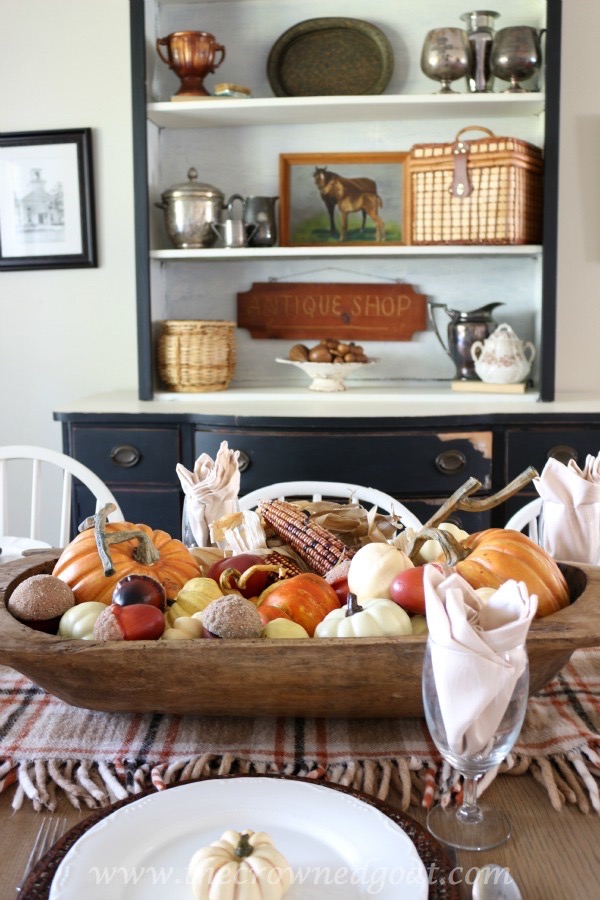 I use this antique dough bowl for all seasons. You can fill it with various pumpkins, gourds, acorns, pinecones, dried hydrangeas, cotton even ornaments for a festive look at a reasonable price.