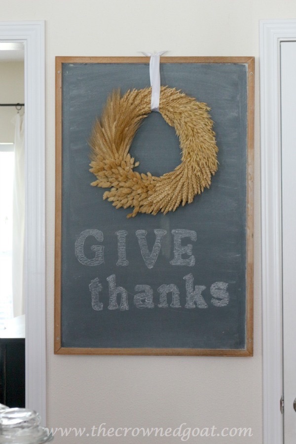 This menu board is updated almost every week. If we’re having guests over we’ll have the menu listed in an area closer to table. I still want it to be pretty in the kitchen so I’ll layer a wreath like this wheat wreath over the chalkboard. This took less than 10 minutes to complete.