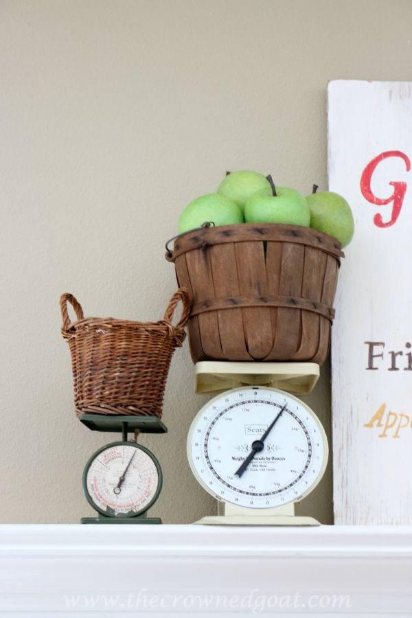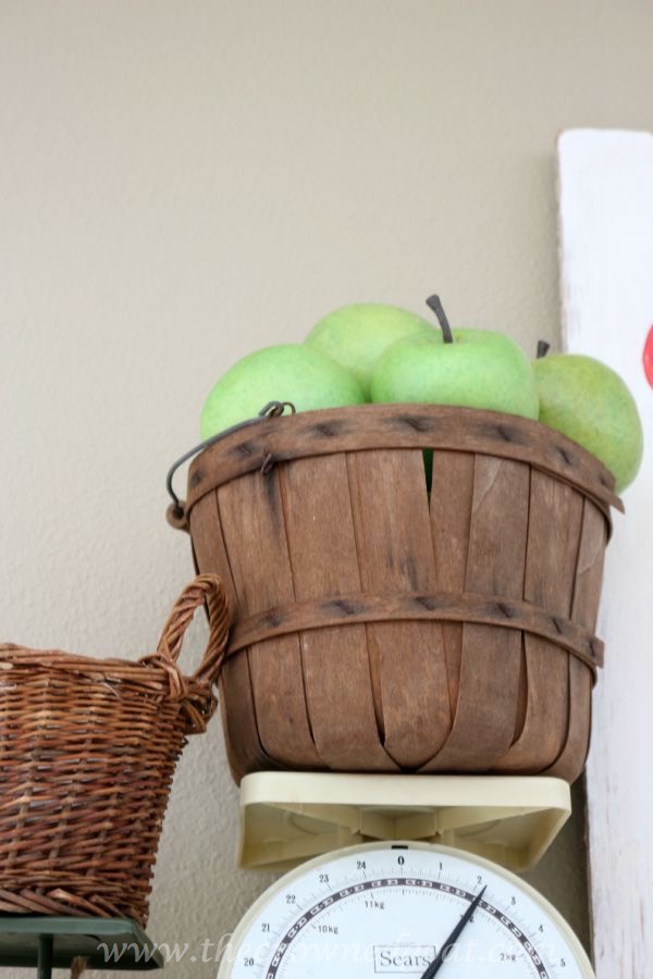 How adorable! The apple picking sign looks great here. And I like how you used the scales. I’ve got a mint green vintage scale, but it’s just been in a cupboard since we moved in. This would be a great use for it!