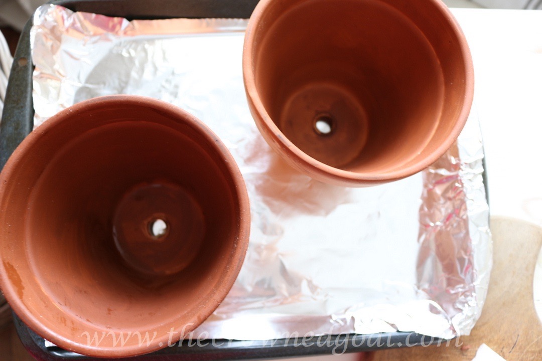 Line a cookie sheet with aluminum foil, place prepared pots onto the foil and into the oven at 200 degrees for one hour. This process is called seasoning. Adjust the amount of time your pots are in the oven based on the amount of pots you are trying to season at one time.