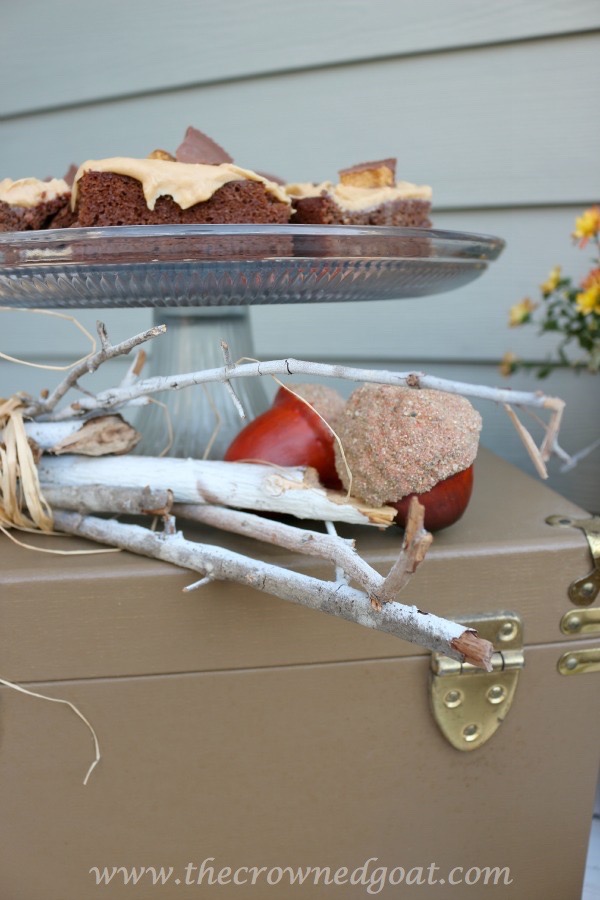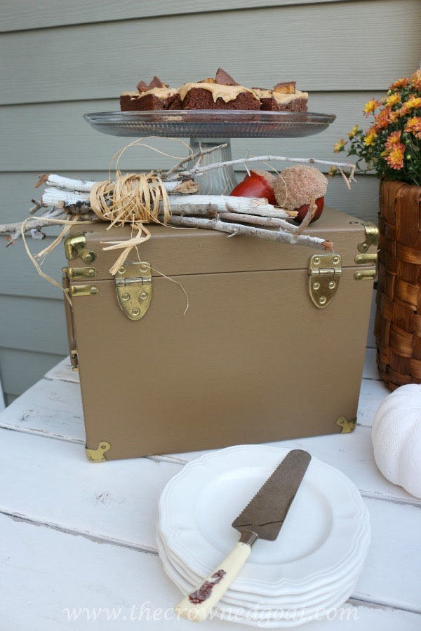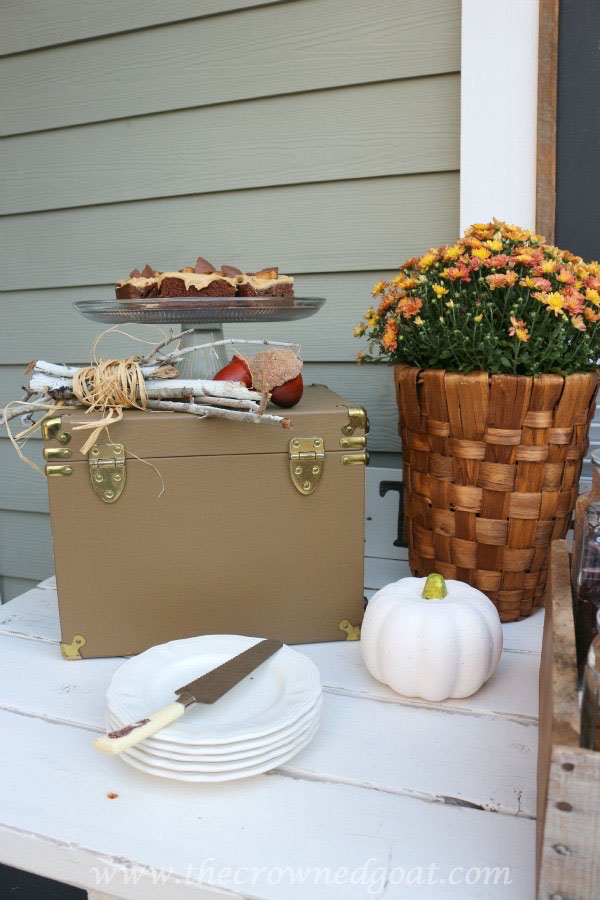 We use this workbench almost like a buffet. It sits really close to our farmhouse table, which makes serving dinner and refilling drinks for family get togethers a cinch. As you guys know, I’m always looking for new ways to mix vintage pieces with new finds. This vintage train case was the perfect perch to hold my delicious peanut butter brownies.