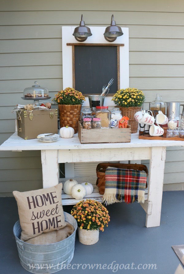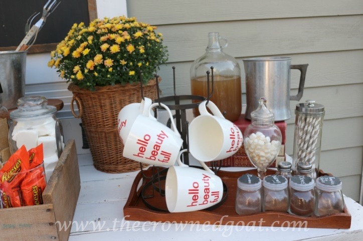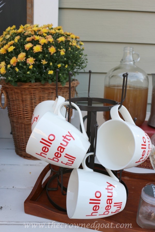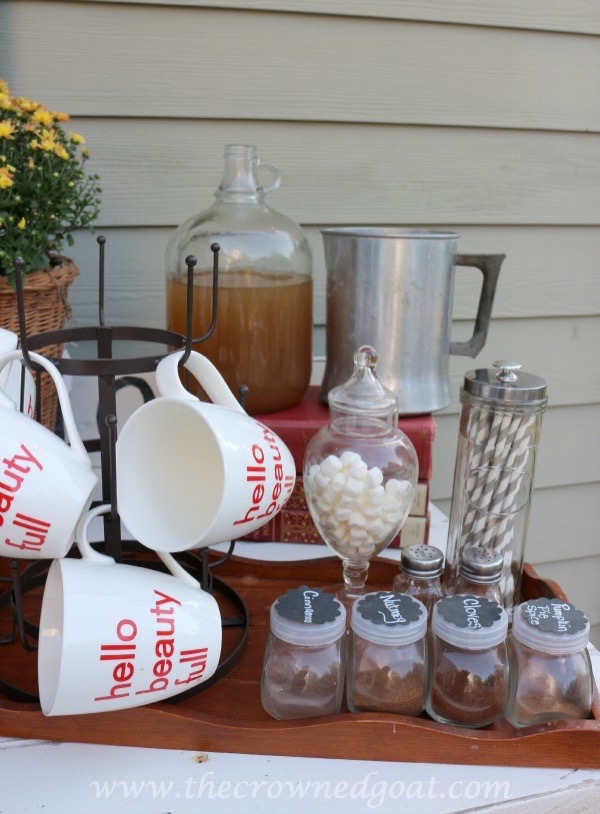 I also like to keep coffee syrups, spices, various creamers and mugs on one tray too. That way it can be easily moved from the outdoor buffet area to the table or the fire pit area for guests to enjoy.