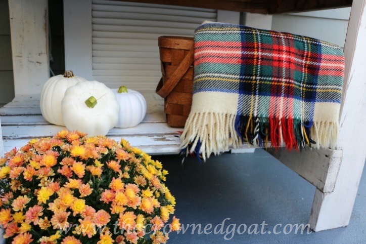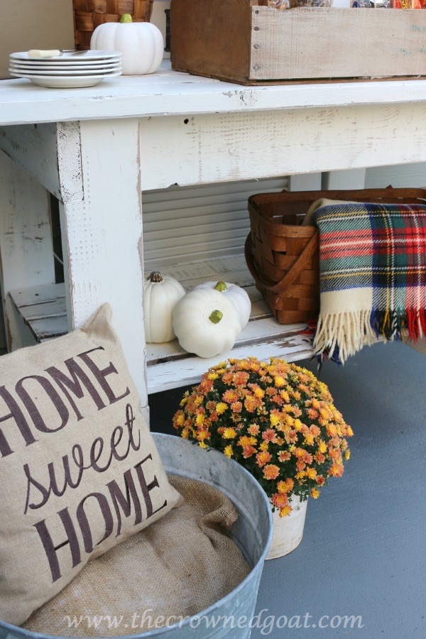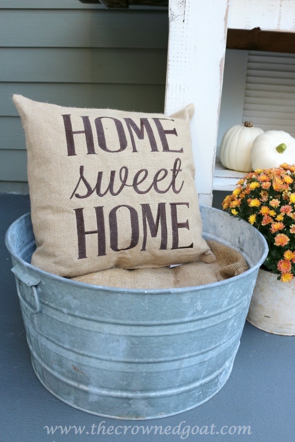 I love everything about this display. It makes me want to decorate my back porch for fall. Love the glass jar with the red lid and the burlap pillow. Too cute!