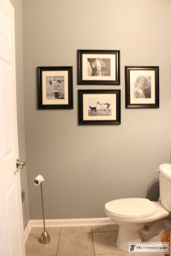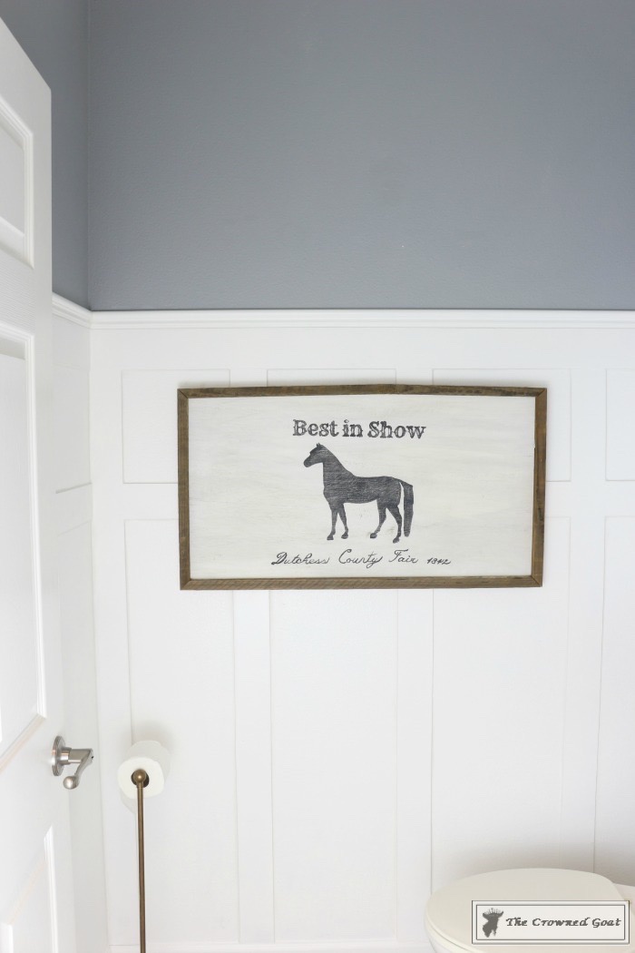 I tried to use the same gallery wall of goat photographs we had previously used in the half bathroom but with all the board and batten, it looked really busy. The horse sign was a good second option though and I was excited to be able to use something we already had on hand.