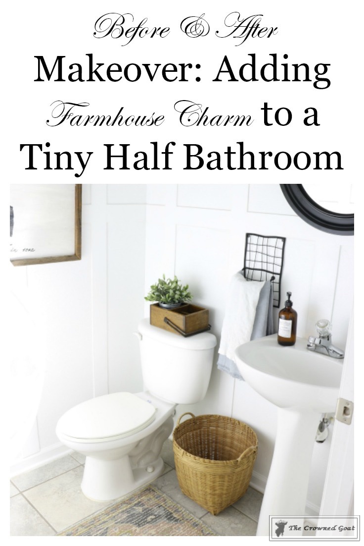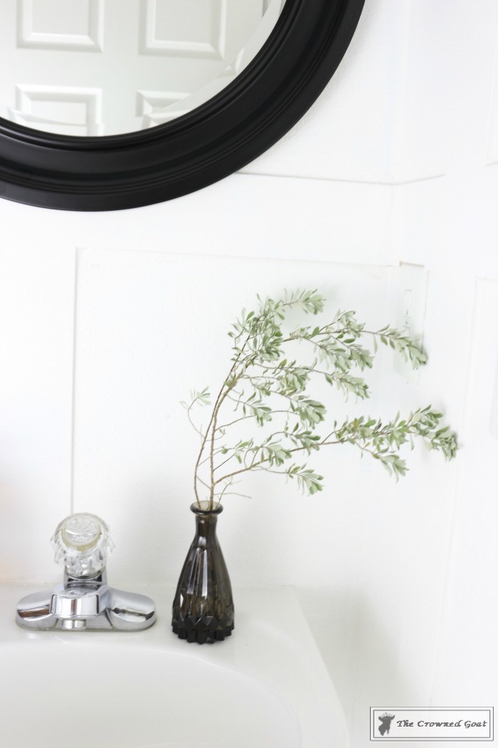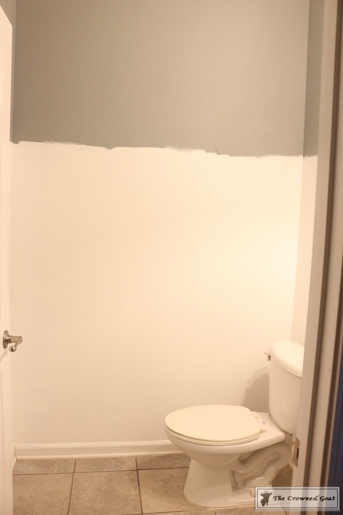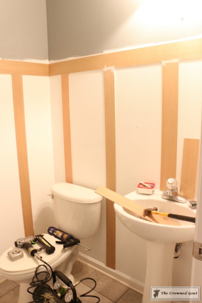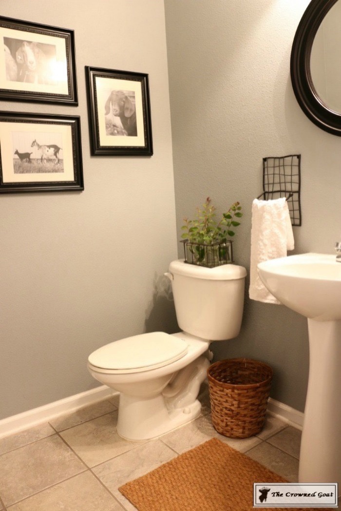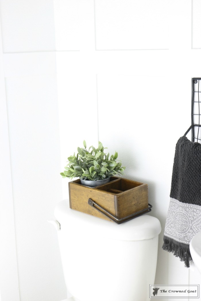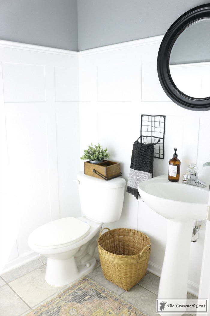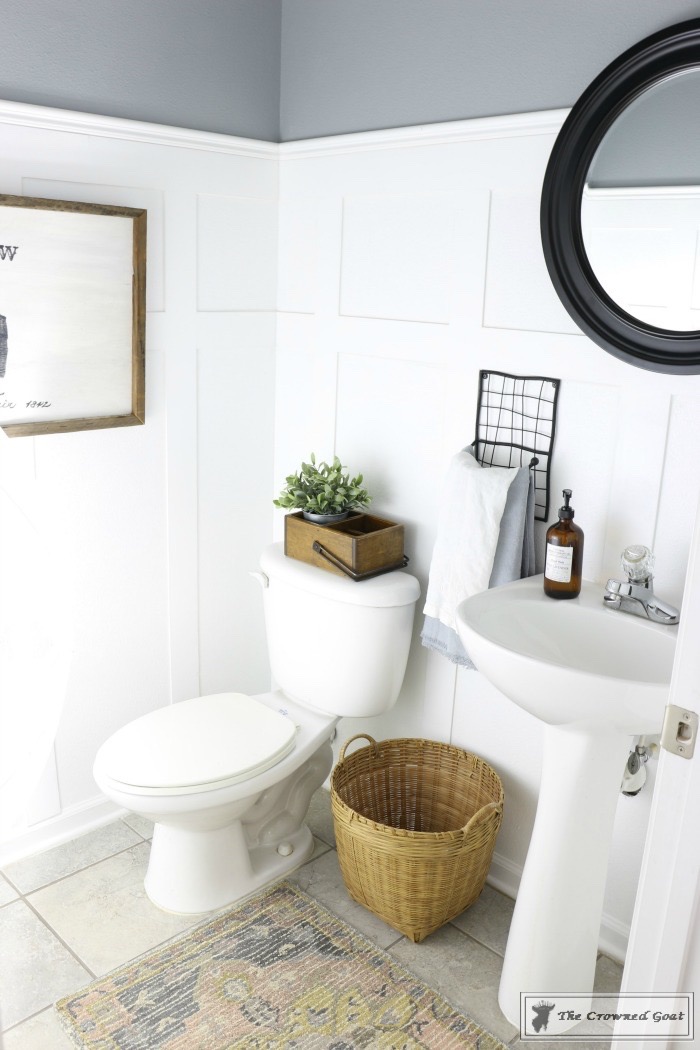 When I first thought about giving the half bath a makeover, it seemed like it would be a pretty straight forward process. We had no plans to change out the gray paint color, the tiled floor, the artwork, the mirror or even the sink. The idea for the makeover was as simple as.…we have leftover paint, boards and battens in the garage…our garage is overflowing…let’s give this half bath a free mini makeover and clear out some clutter in the process.