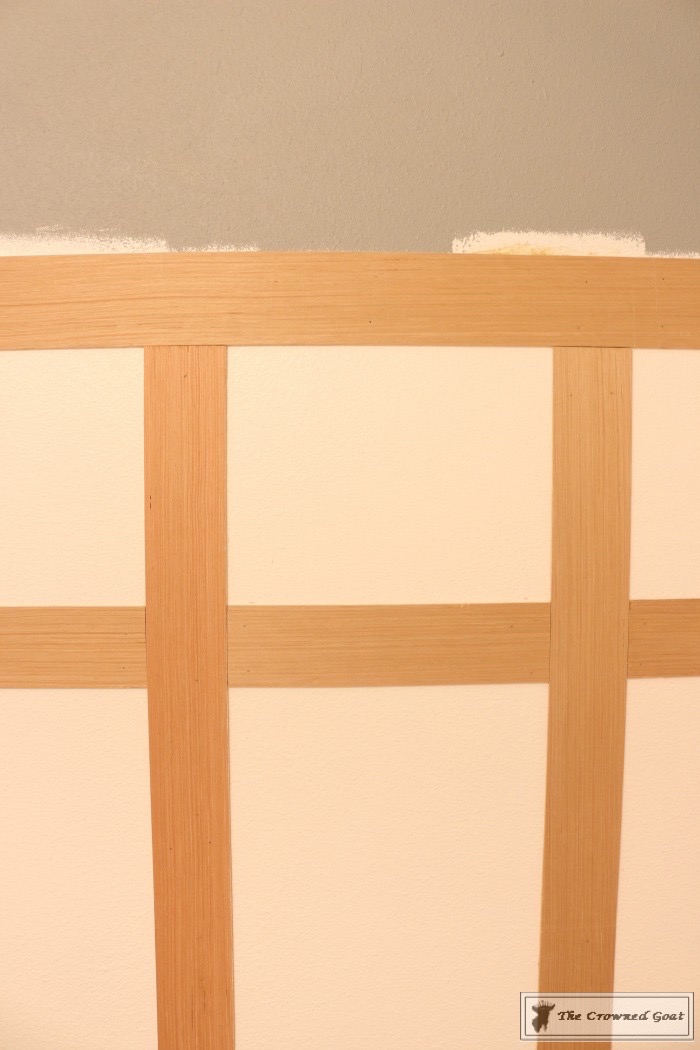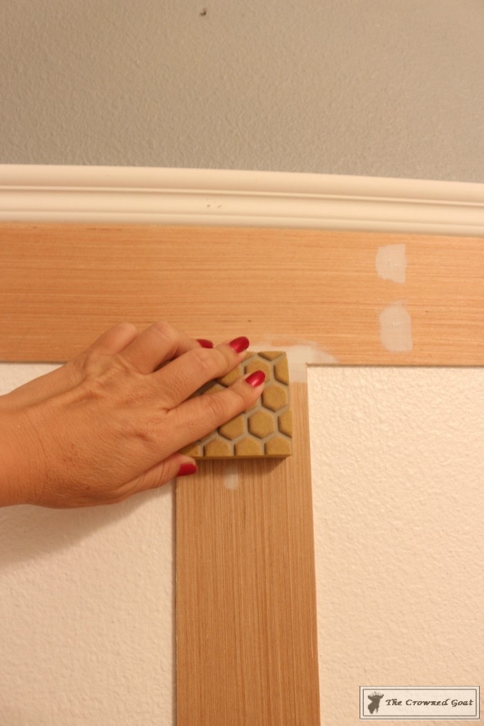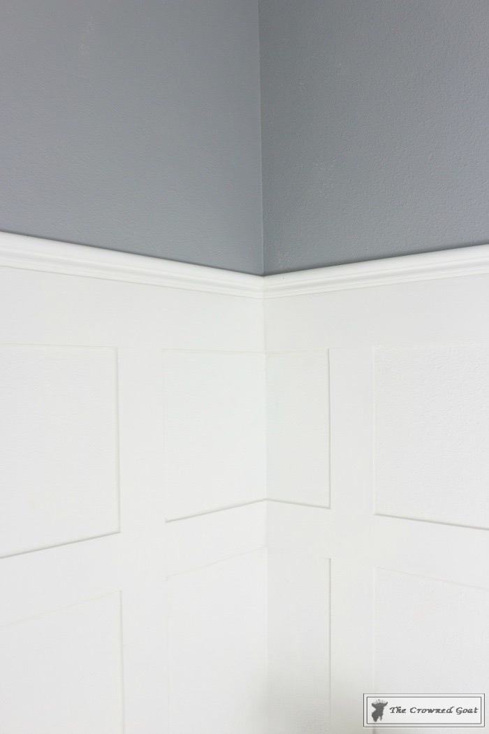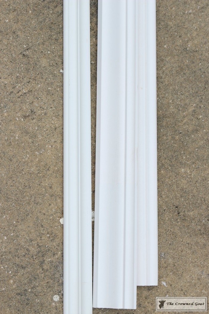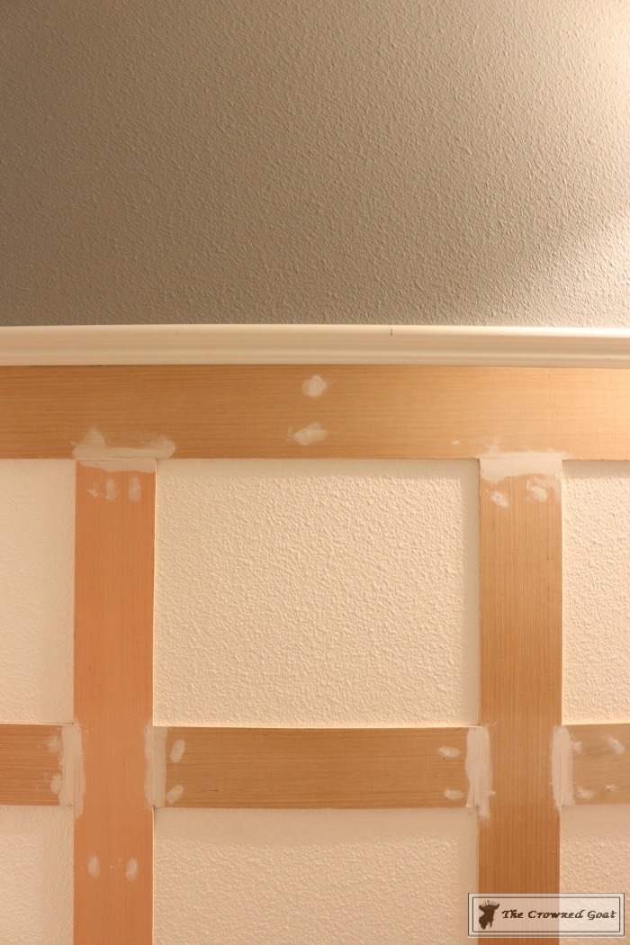 You may notice we had to add a different trim to the top of the boards than the ledge trims we’ve used previously in the office and the master bedroom. That’s because the mirror would not fit with the ledge trim so we had to use this one we also picked up at Lowes.
