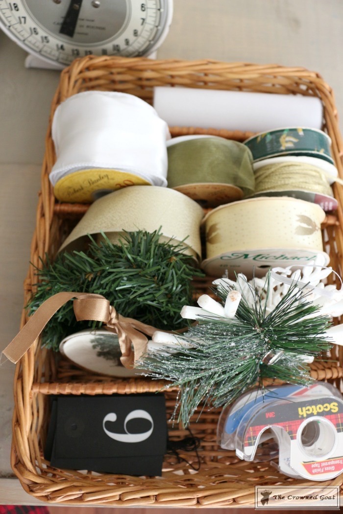 Corral gift wrap and gift wrapping supplies in one location – If you don’t have a paper towel holder you may want to consider hanging a dowel rod or even using a utensils basket like this one to keep your supplies in one location. That way you’ll have ribbons easily accessible as well as craft scissors, writing utensils, tape dispensers and gift tags together and in close proximity. You don’t want to be running around looking for supplies in the middle of your gift wrap sesh.