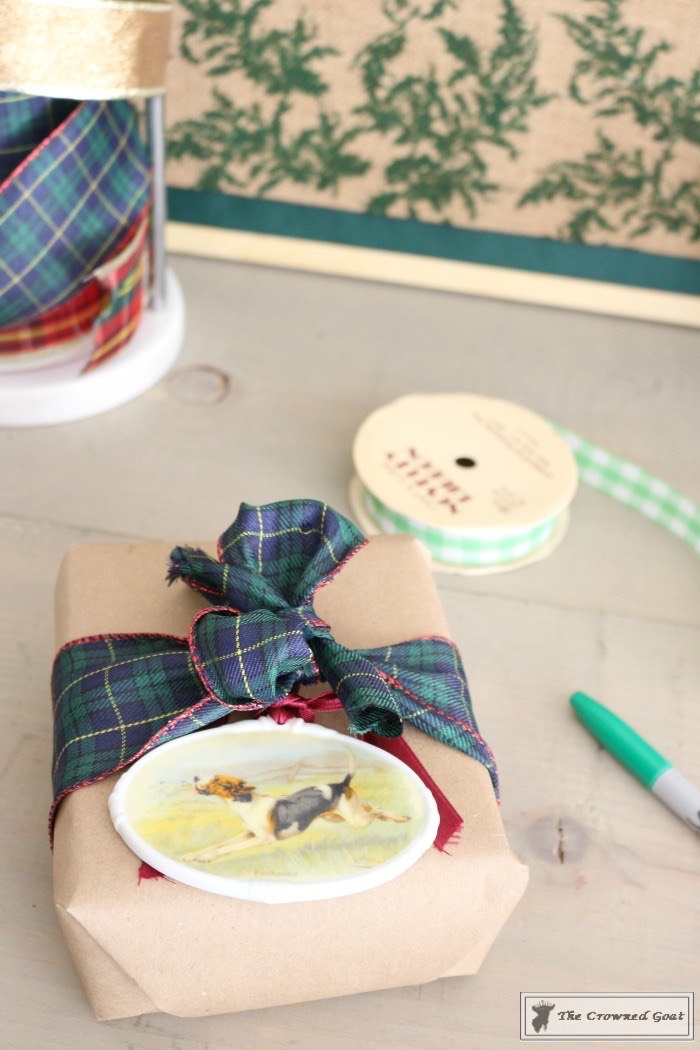 Stock up on ribbons and tissue paper that compliment your color palette – Once you have your color palette in mind, start accumulating ribbon and tissue paper that will help add to the festive nature of your gifts. I’ve found ribbon at big box craft supply stores, dollar stores and even a few thrift stores for just a few dollars. We recently replaced our paper towel holder and the old one was a perfect way to keep holiday ribbons organized.