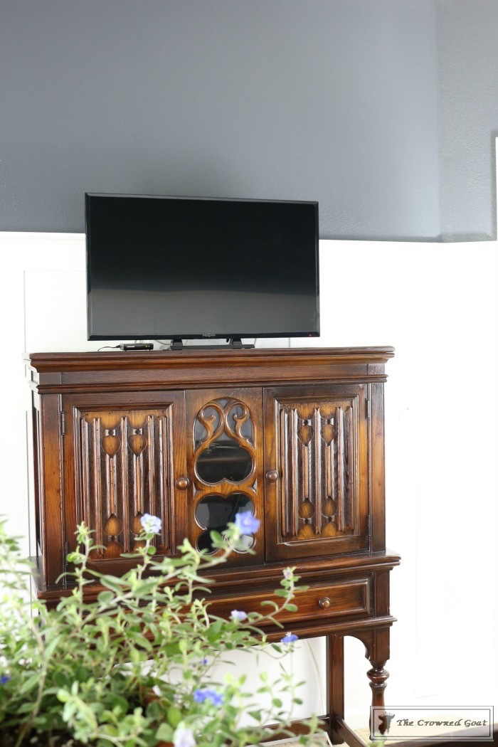 Next, we moved in the antique pieces we knew from the beginning we would be keeping. The piece which stores books, office supplies and the tv…