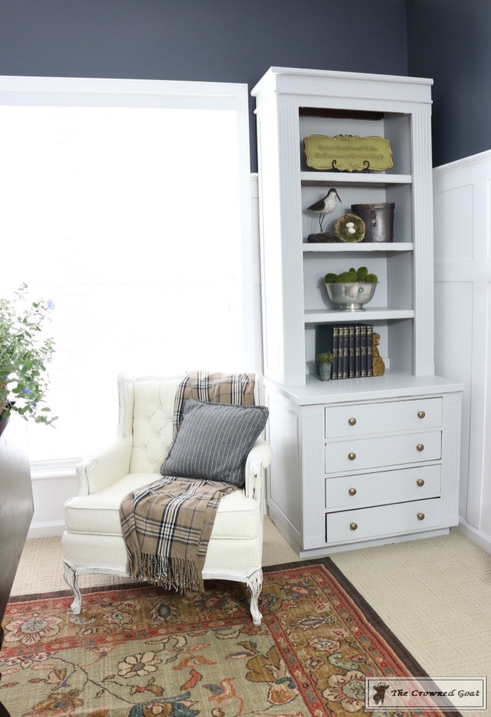 At the last minute, we decided to use another piece from the living room and snuggle this painted chair next to the bookcases. It’s always good to have seating options, right?