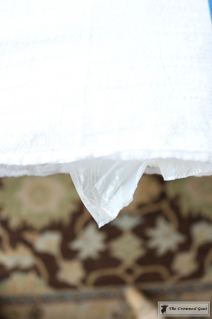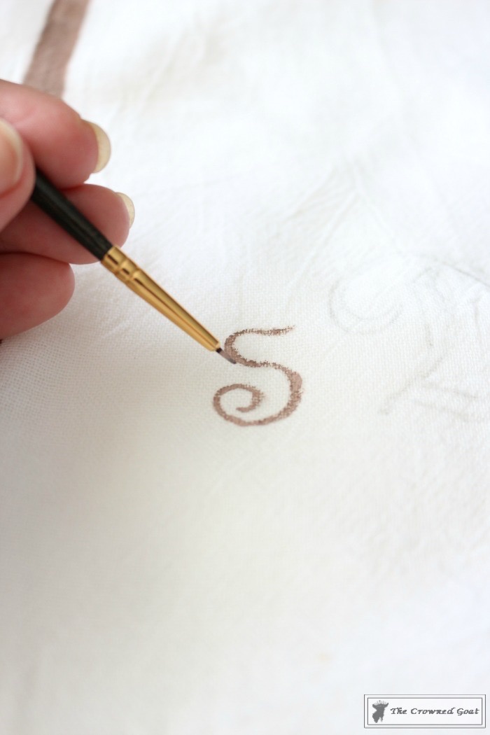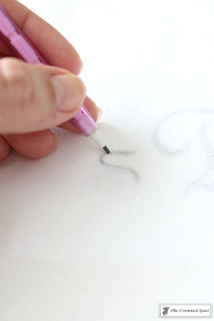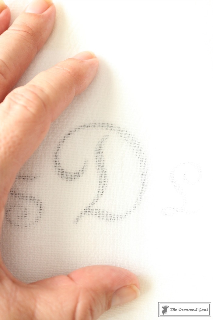 Carefully, place the monogram print out underneath the first layer of the towel. It helps to hang the towel back on the oven so you can get a feel for where you want your monogram to go. I just made a tiny mark with a pencil so I wouldn’t forget.