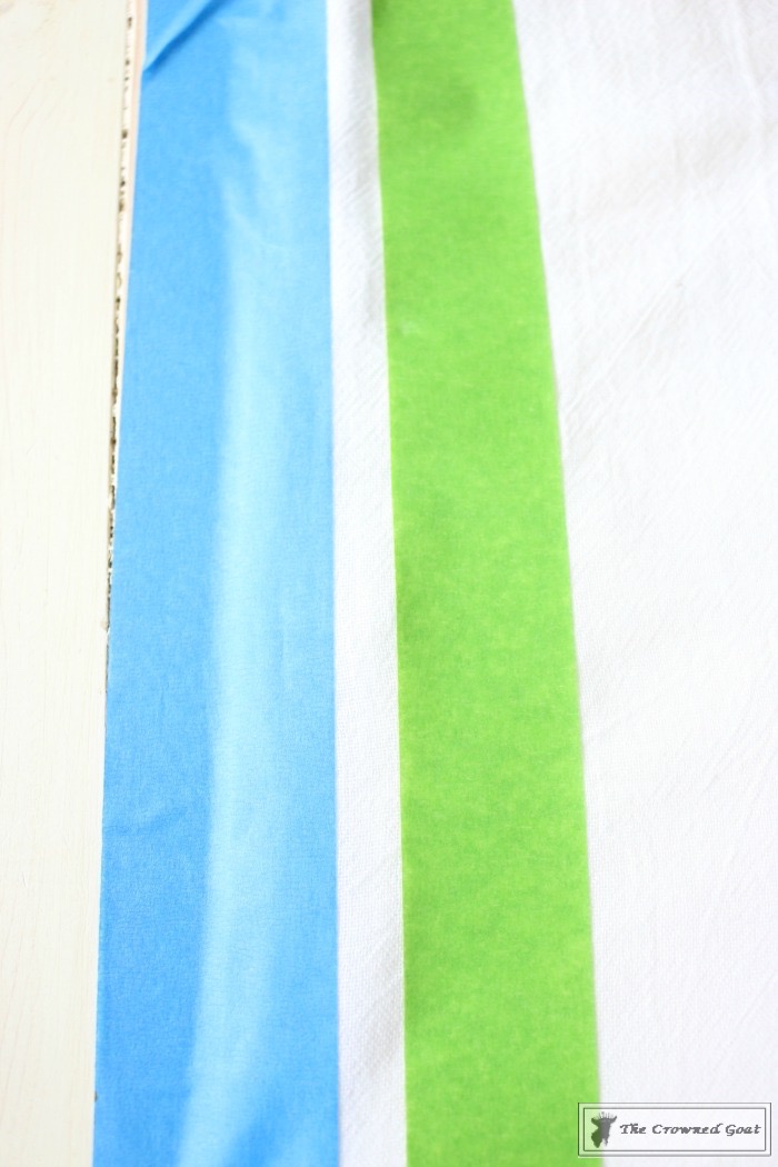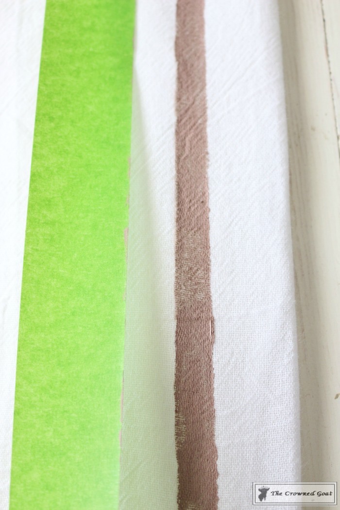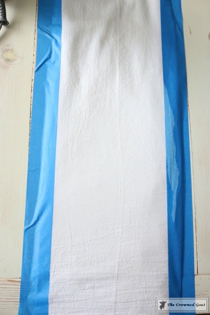 Farmhouse inspired or grain sack fabric usually have 1-3 stripes on them so you decide how many stripes you want to put on your towel. I chose one stripe on each side layering the first piece of tape about ½- ¾ an inch from the fold on each side.
