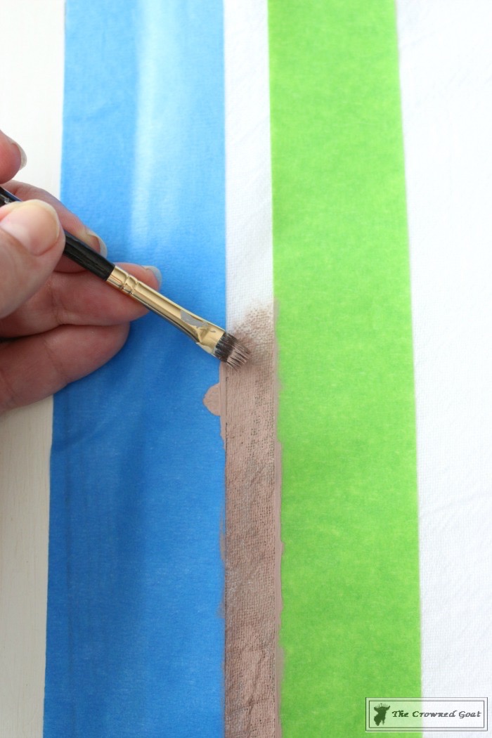 Using an art detail brush and your choice of fabric paint, begin painting the “grain sack stripes” on your towel.