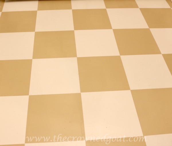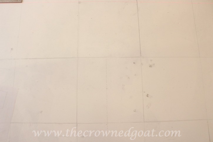 Two coats of white concrete paint later we were ready to map out the checkerboard pattern for the floor. You’ll need a straight edge like a yardstick and a pencil to make a grid pattern. We also used a laser level and a piece of 13 x 13 tile to use as a guide.