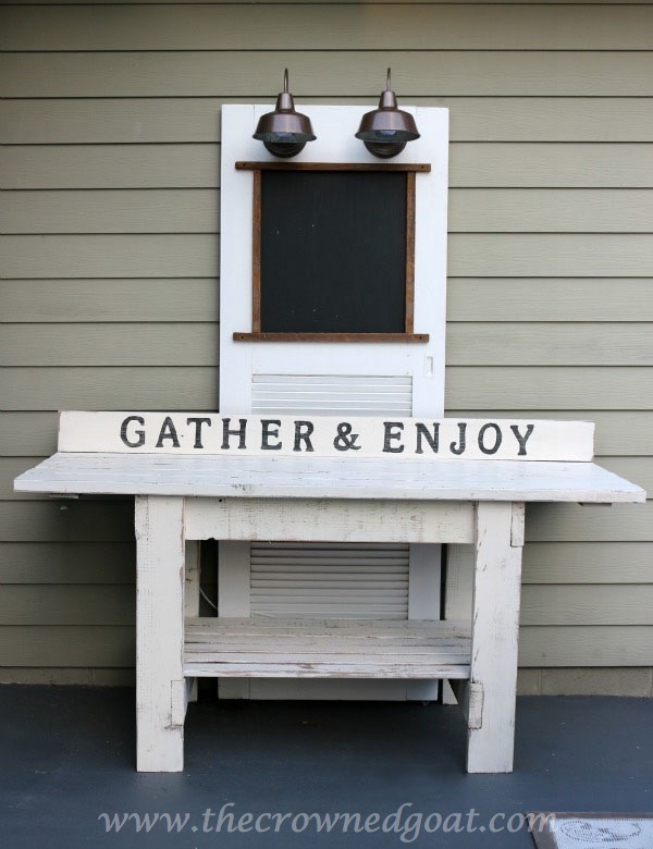 I painted this bench 3 times because I couldn’t get the look I was after. I finally settled on a lighter version of the porch swing frame. It really helped tie in the brown tones from the frame, the lights and the tobacco sticks around the menu board.
