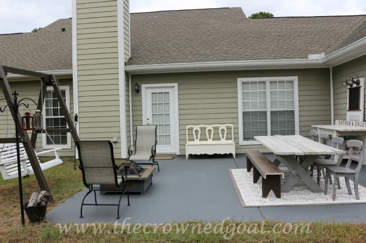 You may remember back in May, we gave the entire back patio area a makeover. We painted the concrete, the door, all the trim, the farmhouse table, porch swing and the swing frame too. At the time it looked really nice but the blistering heat and constant coastal rains really did a number on things. Let me show you what I mean…