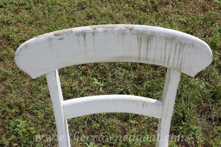 The chairs and bench didn’t fare as well though. Here’s a picture of how the chairs looked before I painted them. I know, yikes!