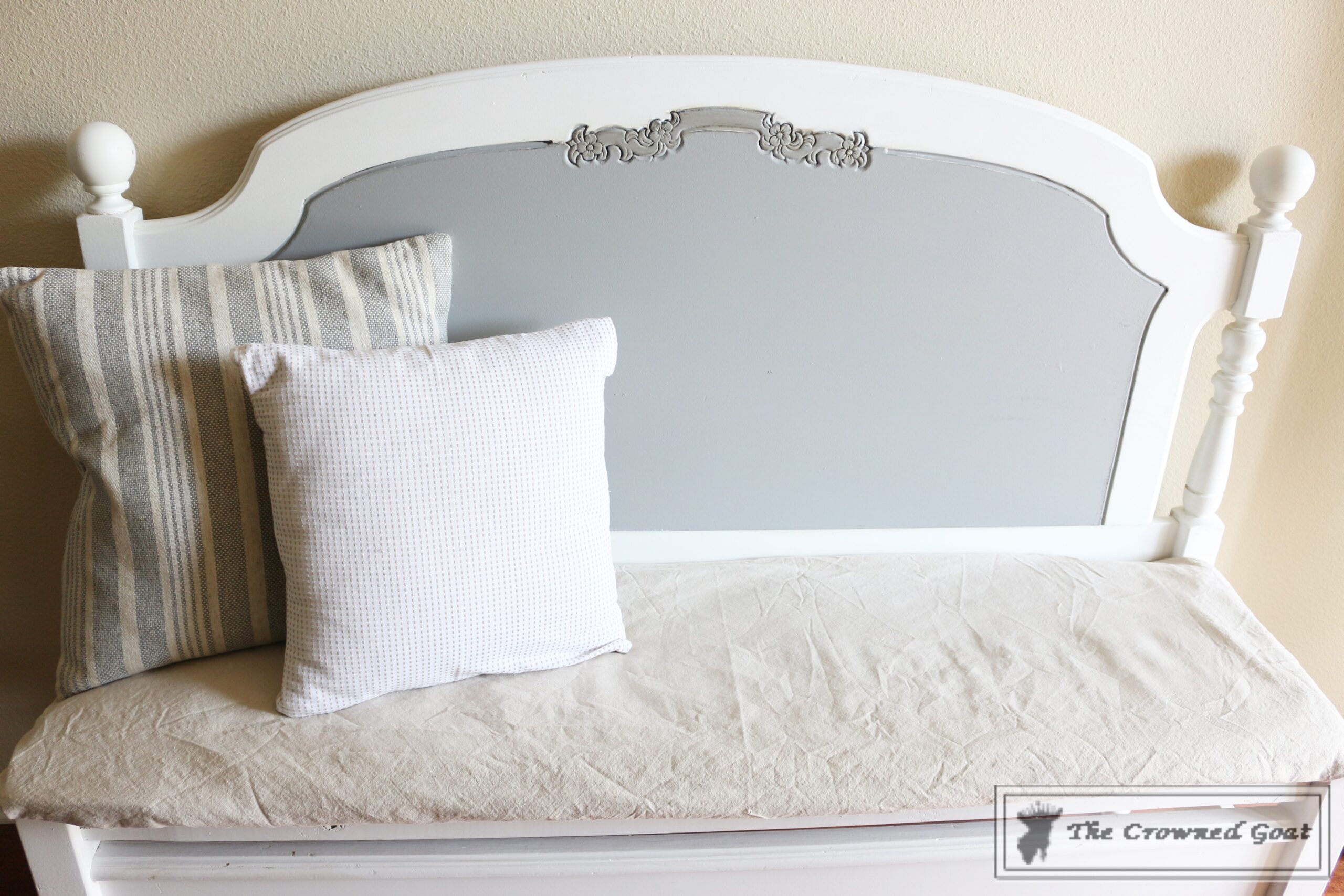 The entire entry is painted in Ralph Lauren’s Oatmeal which fits our neutral loving style and made layering gray and white paint on the bench seem a natural fit. I wanted to soften the space a bit and make the bench more comfortable so I decided to add a bench pad. Luckily, we had some foam left over from when we made the headboard out of a mantel in one of the bedrooms. At first I tried a few different fabric options but nothing really struck my fancy.