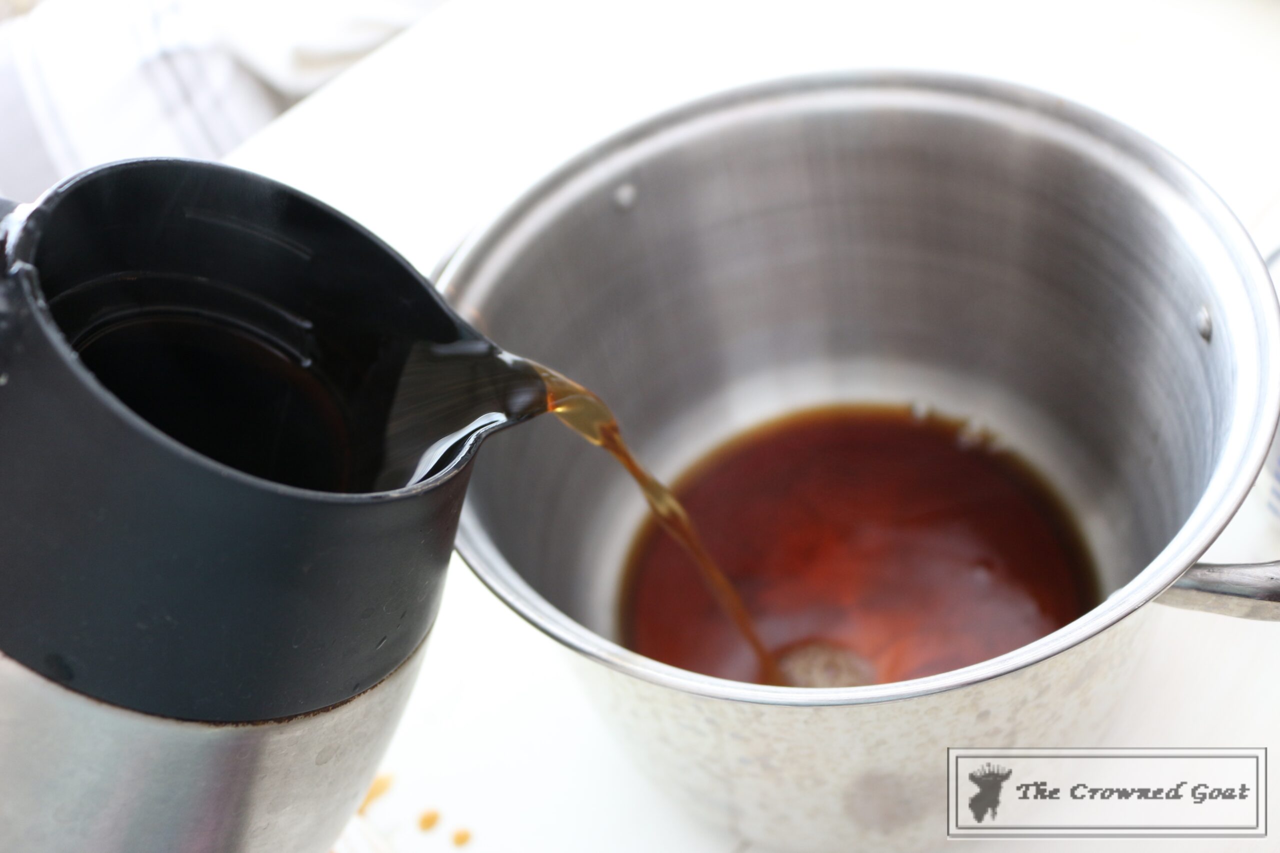 I brewed two pots of coffee and poured them in a large stock pot making sure to keep the contents of both pots hot but not boiling. Use common sense and care when you’re pouring the brewed coffee into the stock pot as the coffee will be hot and may cause burns.