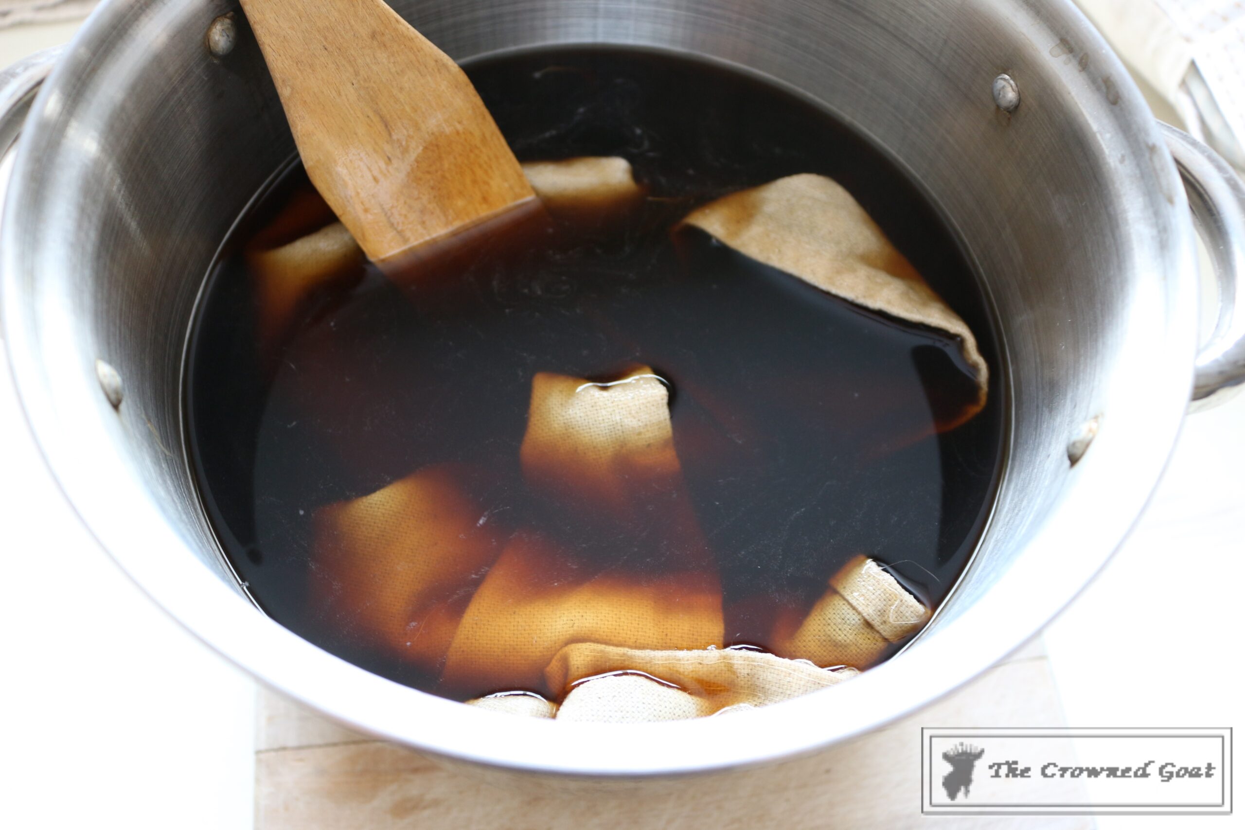 Allow the fabric to steep in the coffee for at least an hour. The longer you allow the fabric to steep the darker/deeper the stain will become. In addition, the stronger the coffee the darker/deeper the stain will become so keep that in mind. I set my timer for an hour but I read online some people let there fabric sit overnight.