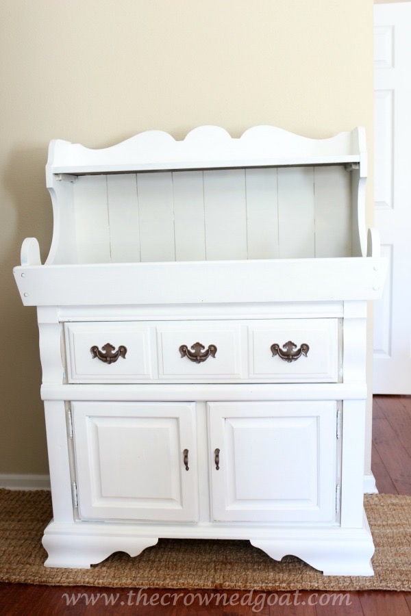 The first step was to paint the piece white with a contrasting custom mix highlighting the planked back and to spray paint the existing hardware hammered bronze. It made a huge difference.