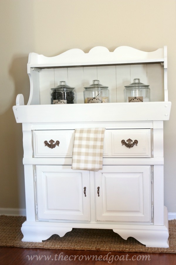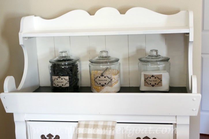 I found half gallon jars to help store laundry soap, clothespins and dryer sheets. I’ll probably utilize the top shelf of the dry sink for these pieces once I get it in the laundry room. The printed labels are using the same style and technique from Pic Monkey that I used for the pantry and kitchen desk.